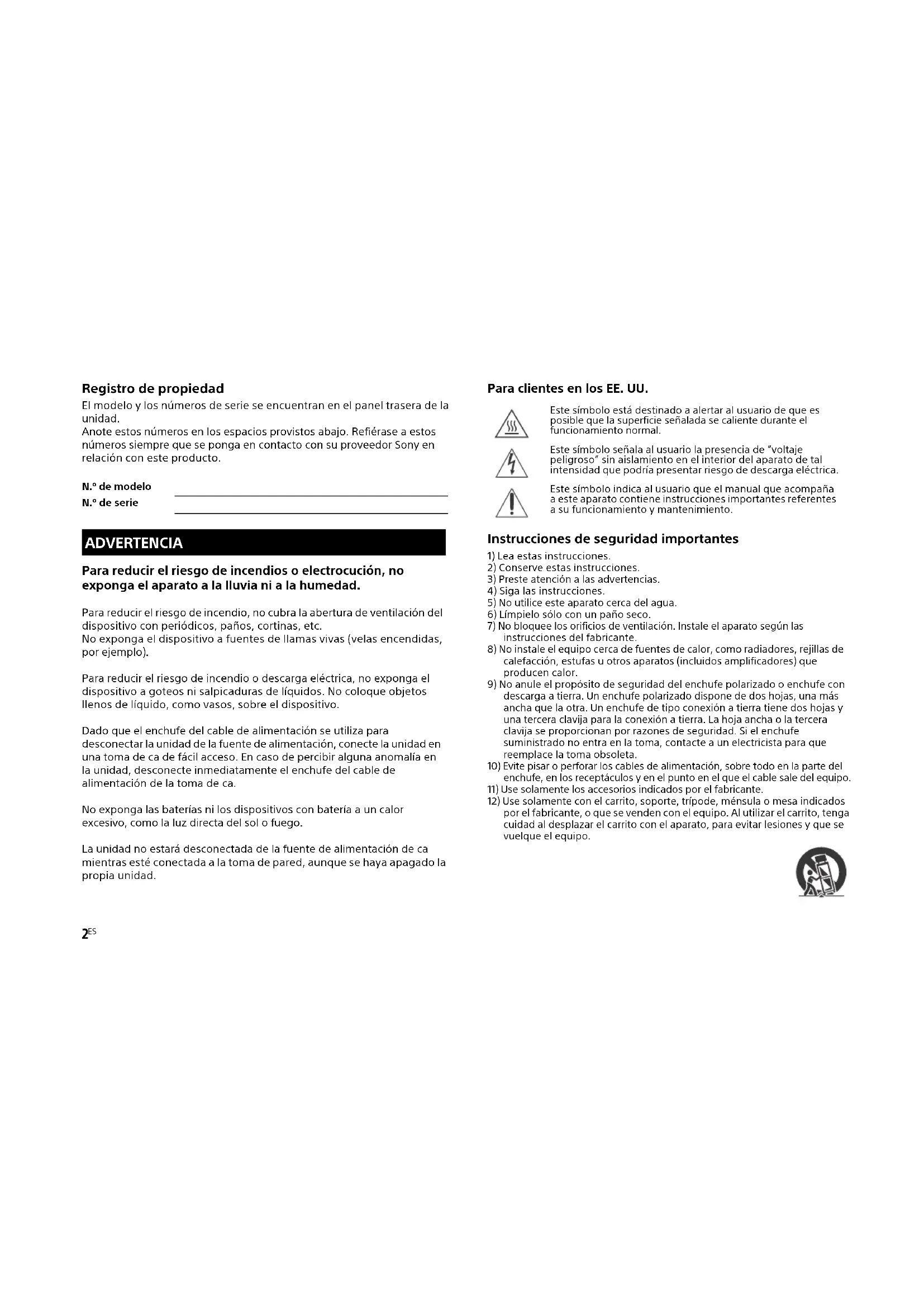 Registro de propiedad El modelo y los números de serie se encuentran en el panel trasera de la unidad. Anote estos números en los espacios provistos abajo. Refiérase a estos números siempre que se ponga en contacto con su proveedor Sony en relación con este producto. Para reducir el riesgo de incendios o electrocución, no exponga el aparato a la lluvia ni a la humedad. Para reducir el riesgo de incendio, no cubra la abertura de ventilación del dispositivo con periódicos, paños, cortinas, etc. No exponga el dispositivo a fuentes de llamas vivas (velas encendidas, por ejemplo). Para reducir el riesgo de incendio o descarga eléctrica, no exponga el dispositivo a goteos ni salpicaduras de líquidos. No coloque objetos llenos de líquido, como vasos, sobre el dispositivo. Dado que el enchufe del cable de alimentación se utiliza para desconectar la unidad de la fuente de alimentación, conecte la unidad en una toma de ca de fácil acceso. En caso de percibir alguna anomalía en la unidad, desconecte inmediatamente el enchufe del cable de alimentación de la toma de ca. No exponga las baterías ni los dispositivos con batería a un calor excesivo, como la luz directa del sol o fuego. La unidad no estará desconectada de la fuente de alimentación de ca mientras esté conectada a la toma de pared, aunque se haya apagado la propia unidad. Para clientes en los EE. UU. Instrucciones de seguridad importantes