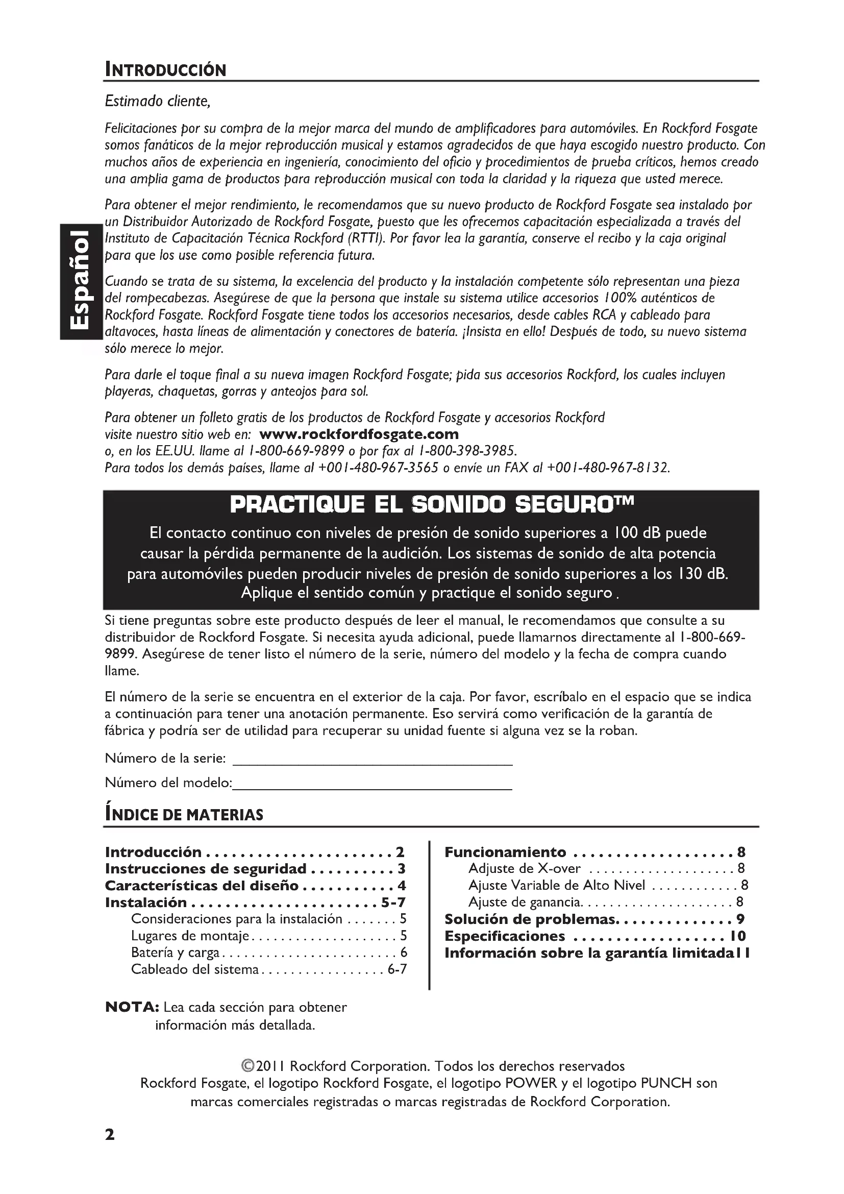 - NOTA: Lea cada sección para obtener información más detallada. Si tiene preguntas sobre este producto después de leer el manual, le recomendamos que consulte a su distribuidor de Rockford Fosgate. Si necesita ayuda adicional, puede llamarnos directamente al 1-800-669- 9899. Asegúrese de tener listo el número de la serie, número del modelo y la fecha de compra cuando llame. El número de la serie se encuentra en el exterior de la caja. Por favor, escríbalo en el espacio que se indica a continuación para tener una anotación permanente. Eso servirá como verificación de la garantía de fábrica y podría ser de utilidad para recuperar su unidad fuente si alguna vez se la roban. Número de la serie: __________________________________ Número del modelo:__________________________________ Introducción p. 2