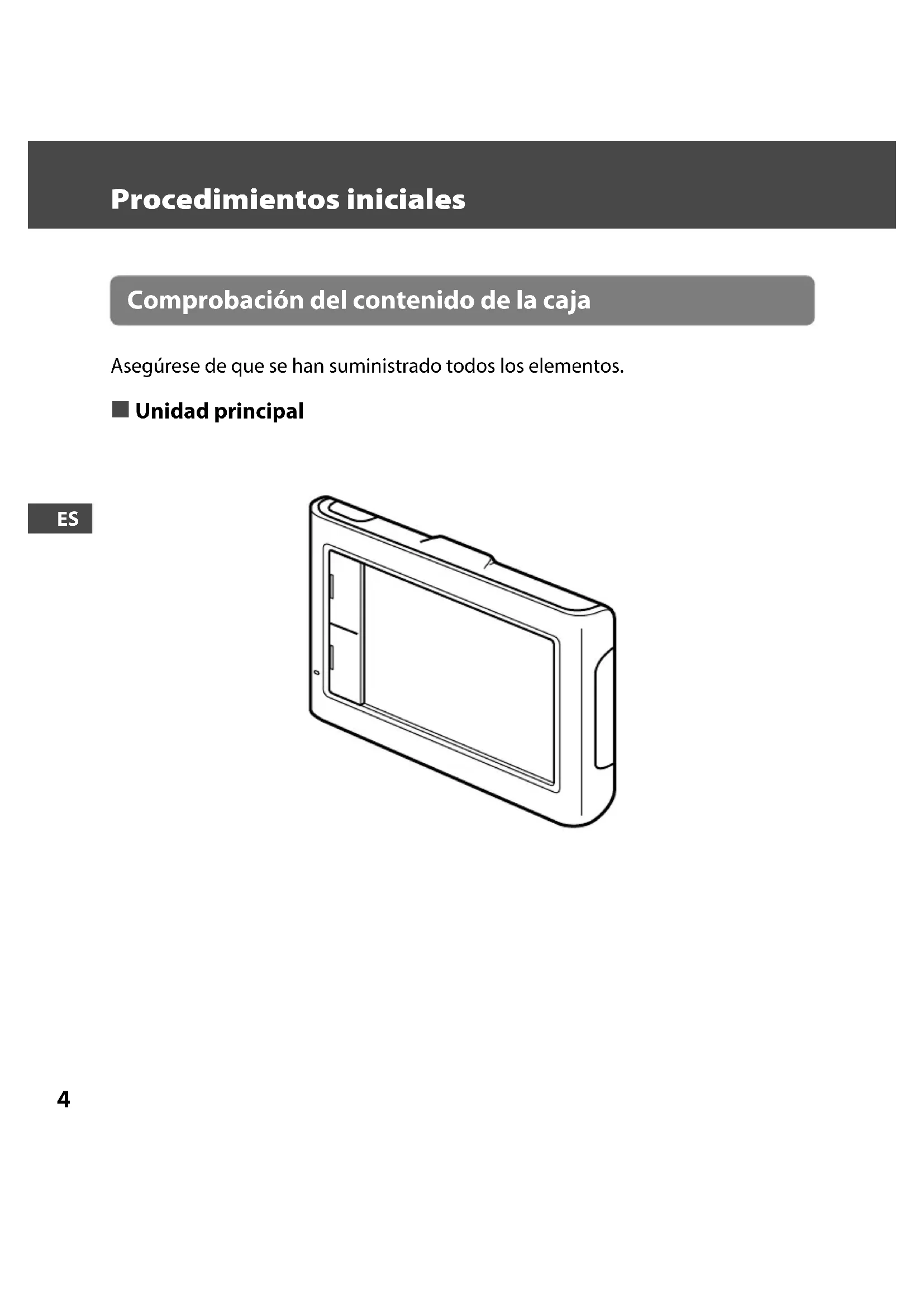 Procedimientos iniciales Comprobación del contenido de la caja Asegúrese de que se han suministrado todos los elementos. Unidad principalSONY NV-U44 (US,FR,ES) 4-000-805-11 (1)