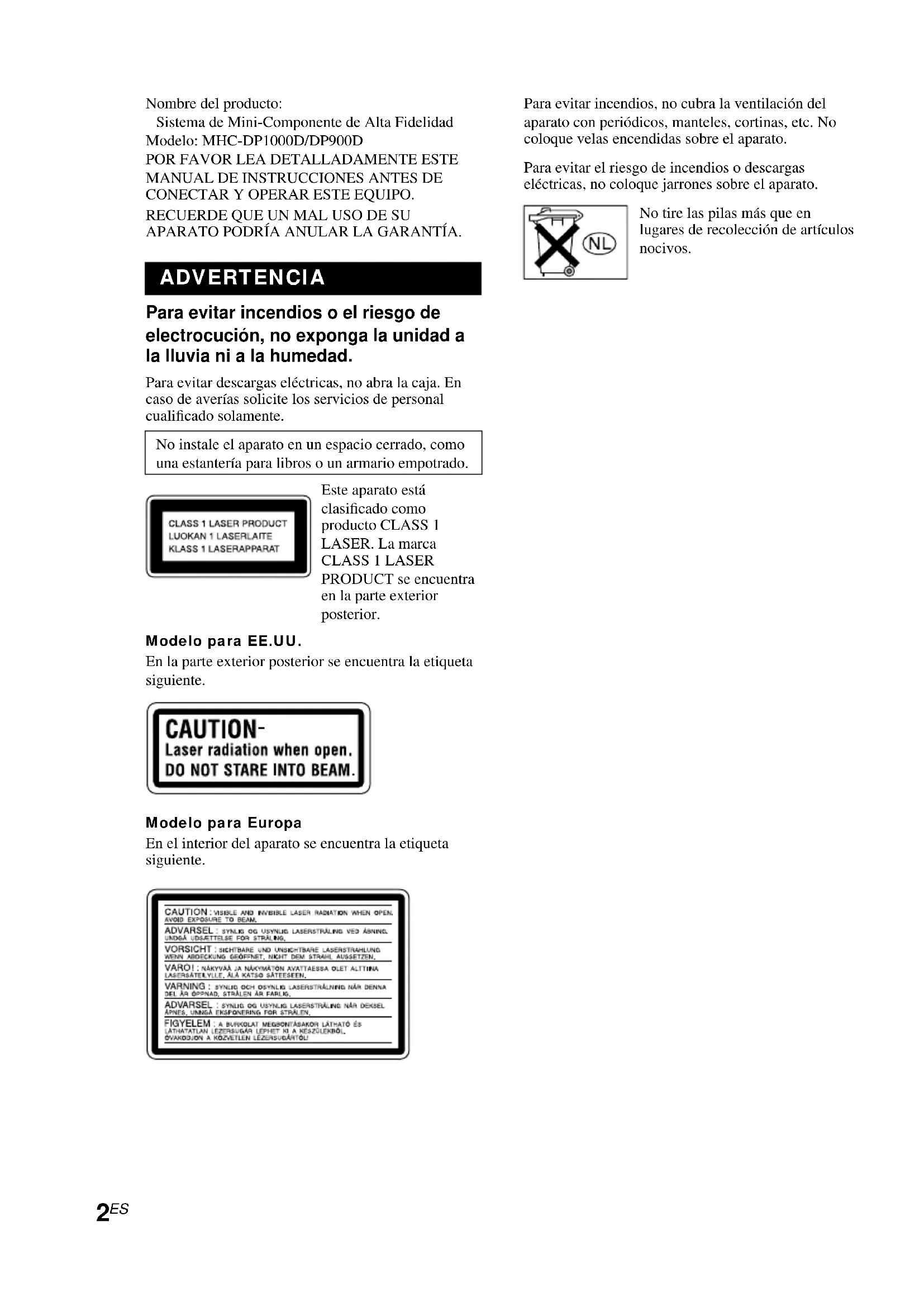 CONECTAR Y OPERAR ESTE EQUIPO. RECUERDE QUE UN MAL USO DE SU APARATO PODRÍA ANULAR LA GARANTÍA. ADVERTENCIA Para evitar incendios o el riesgo de electrocución, no exponga la unidad a la lluvia ni a la humedad. Para evitar descargas eléctricas, no abra la caja. En caso de averías solicite los servicios de personal cualificado solamente. No instale el aparato en un espacio cerrado, como una estantería para libros o un armario empotrado. Este aparato está clasificado como producto CLASS 1 LASER. La marca CLASS 1 LASER PRODUCT se encuentra en la parte exterior posterior. Modelo para EE.UU. En la parte exterior posterior se encuentra la etiqueta siguiente. Modelo para Europa En el interior del aparato se encuentra la etiqueta siguiente. Para evitar incendios, no cubra la ventilación del aparato con periódicos, manteles, cortinas, etc. No coloque velas encendidas sobre el aparato. Para evitar el riesgo de incendios o descargas eléctricas, no coloque jarrones sobre el aparato. No tire las pilas más que en lugares de recolección de artículos nocivos.3
