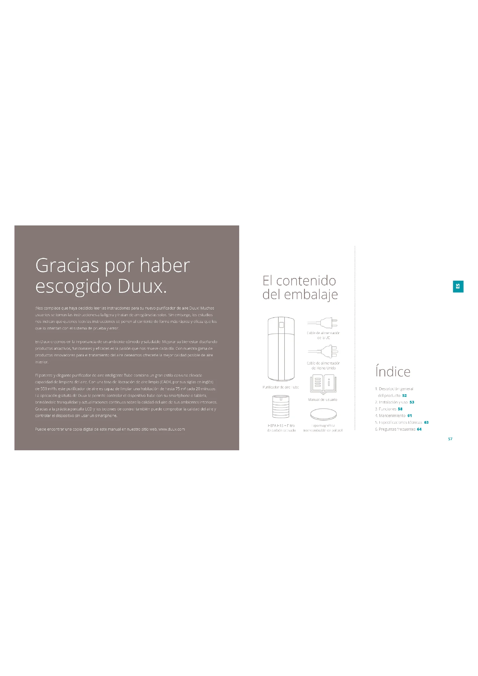 Elimination Conformément à la directive européenne 2012 / 19 / EC sur la mise au rebut des déchets d’équipements électriques et électroniques (DEEE), les appareils ménagers usés ne doivent pas être jetés avec les déchets non triés. Ces appareils usés doivent être collectés séparément des déchets ménagers pour optimiser la récupération et le recyclage de leurs compo-sants dans le but de réduire les eets négatifs sur la santé humaine et sur l’environnement. Le symbole de poubelle avec roulettes et croix indique que ces produits doivent être collectés et mis au rebut séparément des ordures ménagères. Les consommateurs doivent contacter les autorités locales ou leurs revendeurs concernant la mise au rebut de leurs vieux appareils. Notes/notities/les notes/notas/Notitzen5756 Gracias por haber escogido Duux. ¡Nos complace que haya decidido leer las instrucciones para su nuevo puricador de aire Duux! Muchos usuarios se toman las instrucciones a la ligera y tratan de arreglárselas solos. Sin embargo, los estudios nos indican que quienes leen las instrucciones se ponen al corriente de forma más rápida y ecaz que los que lo intentan con el sistema de prueba y error. En Duux creemos en la importancia de un ambiente cómodo y saludable. Mejorar su bienestar diseñando productos atractivos, funcionales y ecaces es la pasión que nos mueve cada día. Con nuestra gama de productos innovadores para el tratamiento del aire deseamos ofrecerle la mejor calidad posible de aire interior. El potente y elegante puricador de aire inteligente Tube combina un gran estilo con una elevada capacidad de limpieza del aire. Con una tasa de liberación de aire limpio (CADR, por sus siglas en inglés) de 550 m³/h, este puricador de aire es capaz de limpiar una habitación de hasta 75 m² cada 20 minutos. La aplicación gratuita de Duux le permite controlar el dispositivo Tube con su smartphone o tableta, brindándole tranquilidad y actualizaciones continuas sobre la calidad del aire de sus ambientes interiores. Gracias a la práctica pantalla LCD y los botones de control también puede comprobar la calidad del aire y controlar el dispositivo sin usar un smartphone. Puede encontrar una copia digital de este manual en nuestro sitio web, www.duux.com