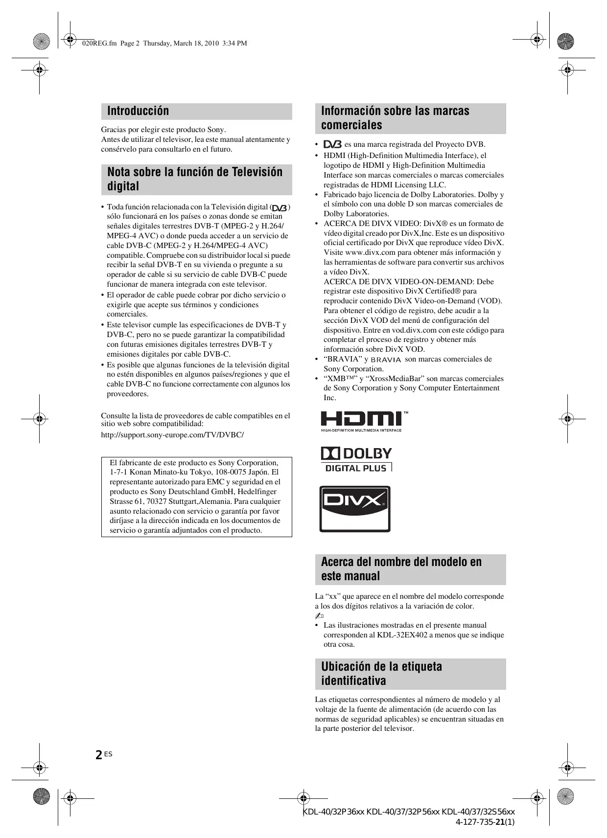 - “XMB™” y “XrossMediaBar” son marcas comerciales de Sony Corporation y Sony Computer Entertainment Inc. Consulte la lista de proveedores de cable compatibles en el sitio web sobre compatibilidad: http://support.sony-europe.com/TV/DVBC/ El fabricante de este producto es Sony Corporation, 1-7-1 Konan Minato-ku Tokyo, 108-0075 Japón. El representante autorizado para EMC y seguridad en el producto es Sony Deutschland GmbH, Hedelfinger Strasse 61, 70327 Stuttgart,Alemania. Para cualquier asunto relacionado con servicio o garantía por favor diríjase a la dirección indicada en los documentos de servicio o garantía adjuntados con el producto. Acerca del nombre del modelo en este manual La “xx” que aparece en el nombre del modelo corresponde a los dos dígitos relativos a la variación de color.