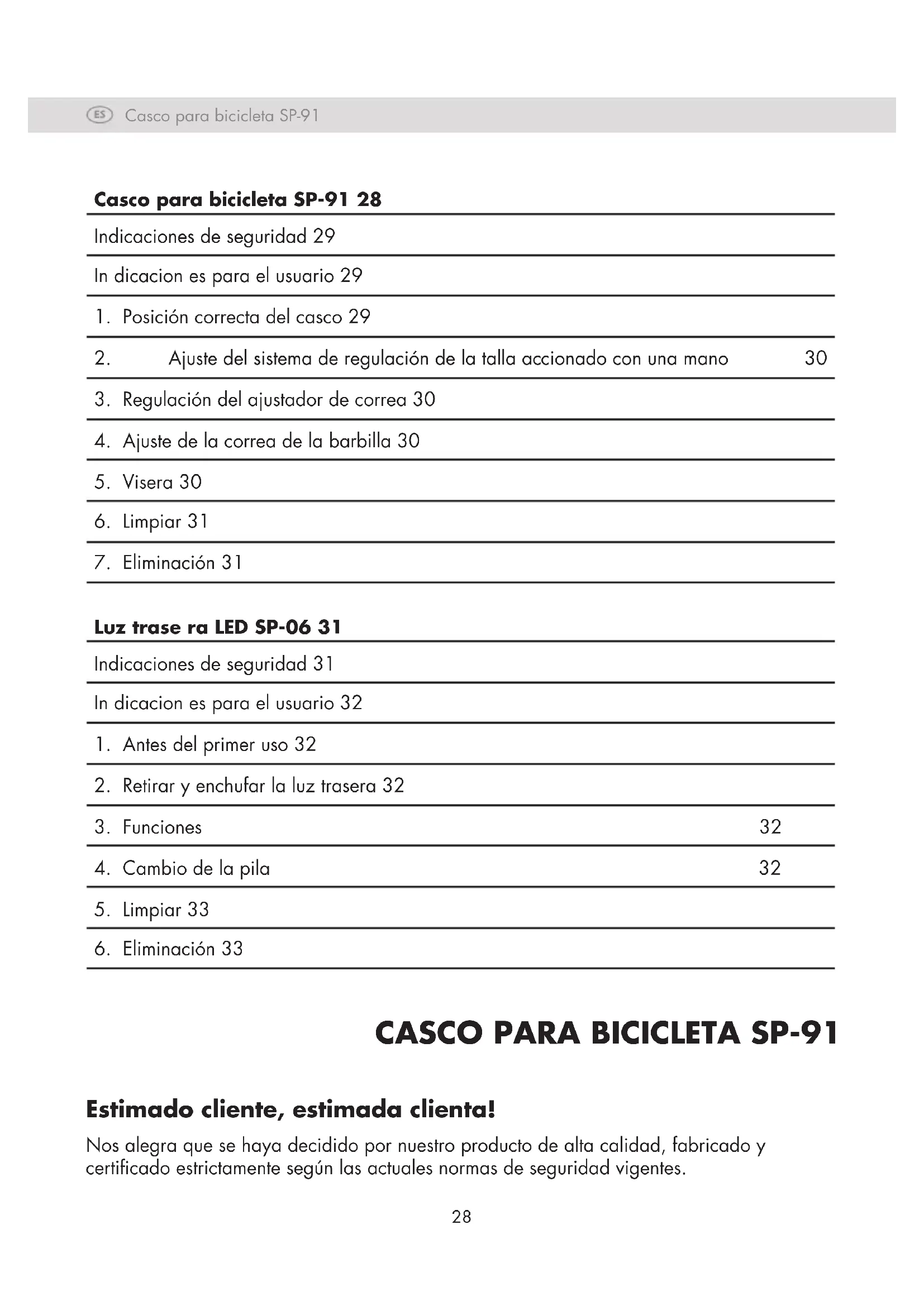 Estimado cliente, estimada clienta! Nos alegra que se haya decidido por nuestro producto de alta calidad, fabricado y certicado estrictamente según las actuales normas de seguridad vigentes. Casco para bicicleta SP-91 28 Indicaciones de seguridad 29 In dicacion es para el usuario 29