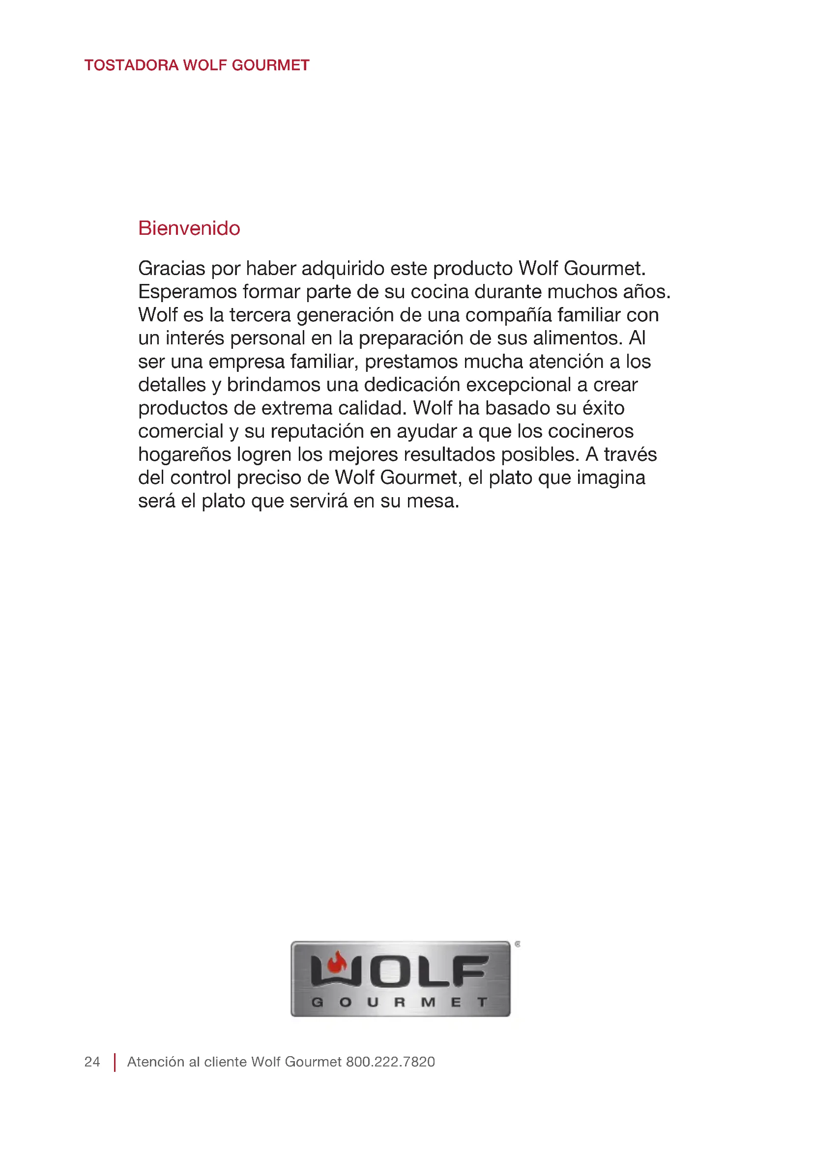 Gracias por haber adquirido este producto Wolf Gourmet. Esperamos formar parte de su comida durante muchos años. Wolf es la tercera generation de una compañero familiar con un(interes personal en la preparacion de sus alimentos. Al ser unaEmpresa familiar, prestamos mucha atencion a los detalles y brindamos una dedicacion exceptional a create products de extrema calidad. Wolf ha basado su exito commercial y su reputacion en poder a que los cocineros hogareños logren los meores resultados posibles. A工程技术 del control precoiso de Wolf Gourmet, el Plato que imagina sera el Plato que servirá en su mesa.