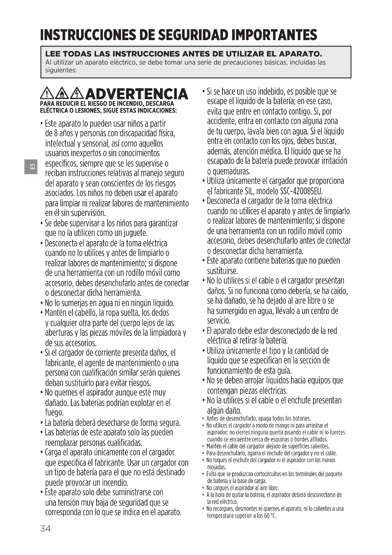 - Este aparato lo pueden usar niños a partir de 8 años y personas con discapacidad física, intelectual y sensorial, así como aquellos usuarios inexpertos o sin conocimientos específicos, siempre que se les supervise o reciban instrucciones relativas al manejo seguro del aparato y sean conscientes de los riesgos asociados. Los niños no deben usar el aparato para limpiar ni realizar labores de mantenimiento en él sin supervisión.