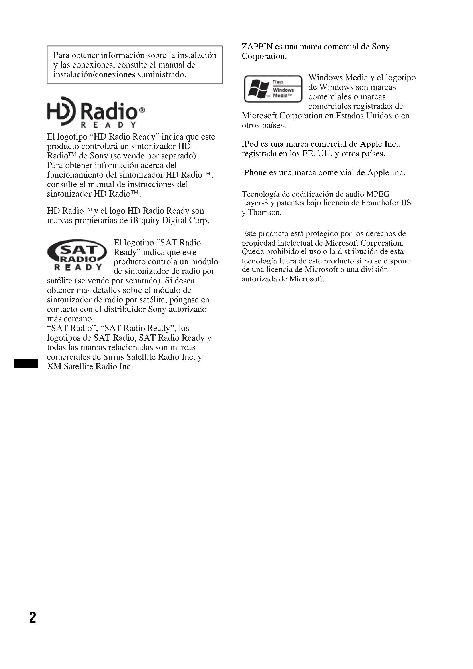 - y el logo HD Radio Ready son marcas propietarias de iBiquity Digital Corp. El logotipo “SAT Radio Ready” indica que este producto controla un módulo de sintonizador de radio por satélite (se vende por separado). Si desea obtener más detalles sobre el módulo de sintonizador de radio por satélite, póngase en contacto con el distribuidor Sony autorizado más cercano. “SAT Radio”, “SAT Radio Ready”, los logotipos de SAT Radio, SAT Radio Ready y todas las marcas relacionadas son marcas comerciales de Sirius Satellite Radio Inc. y XM Satellite Radio Inc. Windows Media y el logotipo de Windows son marcas comerciales o marcas comerciales registradas de Microsoft Corporation en Estados Unidos o en otros países. Tecnología de codificación de audio MPEG Layer-3 y patentes bajo licencia de Fraunhofer IIS y Thomson. Este producto está protegido por los derechos de propiedad intelectual de Microsoft Corporation. Queda prohibido el uso o la distribución de esta tecnología fuera de este producto si no se dispone de una licencia de Microsoft o una división autorizada de Microsoft.3 Advertencia: si el encendido del automóvil no dispone de una posición ACC Asegúrese de ajustar la función de desconexión automática (página 18). La unidad se apagará completa y automáticamente en el tiempo establecido después de apagarla, lo cual evita que se agote la batería. Si no ajusta la función de desconexión automática, mantenga presionado (OFF) hasta que se apague la pantalla cada vez que apague el motor. Los proveedores de contenidos utilizan la tecnología de gestión de derechos digitales para Windows Media contenida en este dispositivo (“WM-DRM”) para proteger la integridad de su contenido (“Contenido seguro”) para que no se realice un uso inapropiado de su propiedad intelectual, incluyendo el copyright. Este dispositivo utiliza software WM-DRM para reproducir Contenido seguro (“Software WM- DRM”). Si la seguridad del Software WM-DRM de este dispositivo está en peligro, los propietarios de los Contenido seguro (“Propietarios del contenido seguro”) pueden solicitar que Microsoft revoque el derecho del Software WM-DRM a adquirir nuevas licencias para copiar, visualizar y/o reproducir Contenido seguro. La revocación no afecta a la capacidad del Software WM-DRM para reproducir contenido no protegido. Se envía al dispositivo una lista del Software WM-DRM revocado cuando descarga una licencia para Contenido seguro de Internet o de un PC. En conjunción con esta licencia, Microsoft puede descargar también listas de revocación en su dispositivo de parte del programa de propietarios de contenidos seguros.4 Tabla de contenido Procedimientos iniciales Discos que se pueden reproducir en esta unidad p. 6