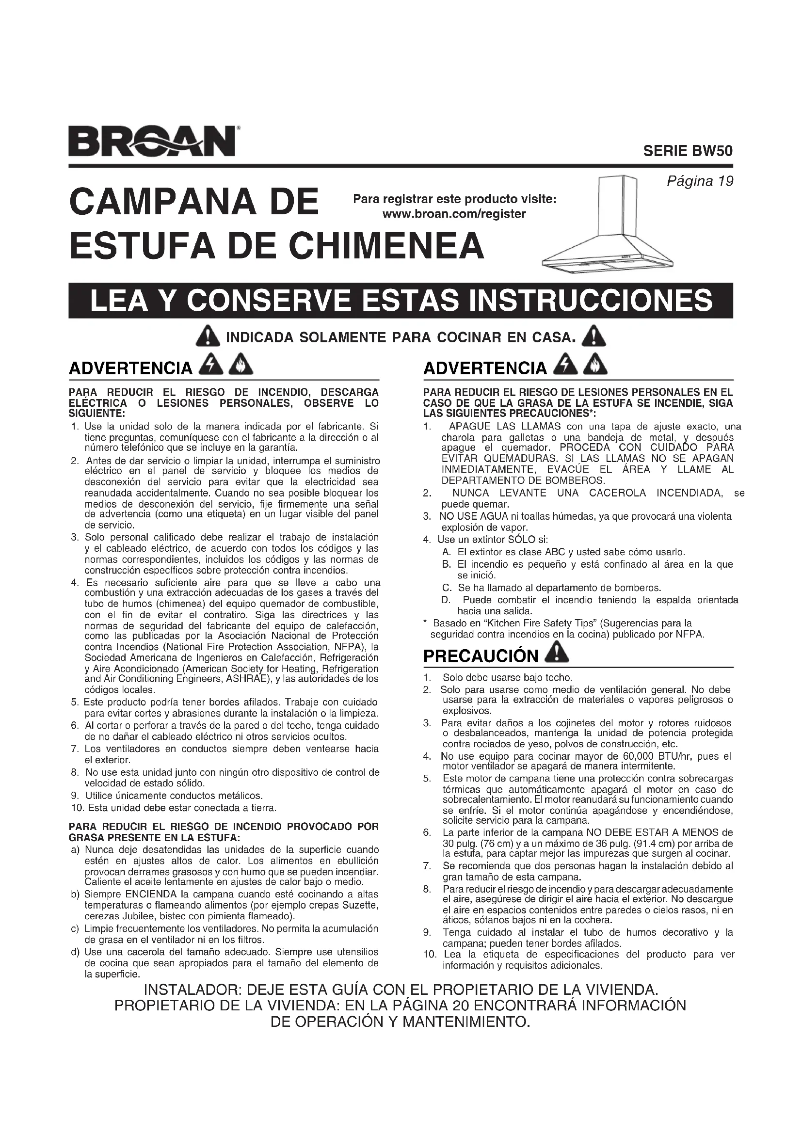 PARA REDUCIR EL RIESGO DE INCENDIO, DESCARGA ELÉCTRICA O LESIONES PERSONALES, OBSERVE LO SIGUIENTE:1. Use la unidad solo de la manera indicada por el fabricante. Si tiene preguntas, comuníquese con el fabricante a la dirección o al número telefónico que se incluye en la garantía.2. Antes de dar servicio o limpiar la unidad, interrumpa el suministro eléctrico en el panel de servicio y bloquee los medios de desconexión del servicio para evitar que la electricidad sea reanudada accidentalmente. Cuando no sea posible bloquear los medios de desconexión del servicio, fije firmemente una señal de advertencia (como una etiqueta) en un lugar visible del panel deservicio.3. Solo personal calificado debe realizar el trabajo de instalación y el cableado eléctrico, de acuerdo con todos los códigos y las normas correspondientes, incluidos los códigos y las normas de construcción específicos sobre protección contra incendios.4. Es necesario suficiente aire para que se lleve a cabo una combustión y una extracción adecuadas de los gases a través del tubo de humos (chimenea) del equipo quemador de combustible, con el fin de evitar el contratiro. Siga las directrices y las normas de seguridad del fabricante del equipo de calefacción, como las publicadas por la Asociación Nacional de Protección contra Incendios (National Fire Protection Association, NFPA), la Sociedad Americana de Ingenieros en Calefacción, Refrigeración y Aire Acondicionado (American Society for Heating, Refrigeration and Air Conditioning Engineers, ASHRAE), y las autoridades de los códigos locales.5. Este producto podría tener bordes afilados. Trabaje con cuidado para evitar cortes y abrasiones durante la instalación o la limpieza.6. Al cortar o perforar a través de la pared o del techo, tenga cuidado de no dañar el cableado eléctrico ni otros servicios ocultos.7. Los ventiladores en conductos siempre deben ventearse hacia elexterior.8. No use esta unidad junto con ningún otro dispositivo de control de velocidad de estado sólido.9. Utilice únicamente conductos metálicos.10. Esta unidad debe estar conectada a tierra.PARA REDUCIR EL RIESGO DE INCENDIO PROVOCADO POR GRASA PRESENTE EN LA ESTUFA:a) Nunca deje desatendidas las unidades de la superficie cuando estén en ajustes altos de calor. Los alimentos en ebullición provocan derrames grasosos y con humo que se pueden incendiar. Caliente el aceite lentamente en ajustes de calor bajo o medio.b) Siempre ENCIENDA la campana cuando esté cocinando a altas temperaturas o flameando alimentos (por ejemplo crepas Suzette, cerezas Jubilee, bistec con pimienta flameado).c) Limpie frecuentemente los ventiladores. No permita la acumulación de grasa en el ventilador ni en los filtros.d) Use una cacerola del tamaño adecuado. Siempre use utensilios de cocina que sean apropiados para el tamaño del elemento de lasuperficie. ADVERTENCIA PARA REDUCIR EL RIESGO DE LESIONES PERSONALES EN EL CASO DE QUE LA GRASA DE LA ESTUFA SE INCENDIE, SIGA LAS SIGUIENTES PRECAUCIONES*:1. APAGUE LAS LLAMAS con una tapa de ajuste exacto, una charola para galletas o una bandeja de metal, y después apague el quemador. PROCEDA CON CUIDADO PARA EVITAR QUEMADURAS. SI LAS LLAMAS NO SE APAGAN INMEDIATAMENTE, EVACÚE EL ÁREA Y LLAME AL DEPARTAMENTO DE BOMBEROS.2. NUNCA LEVANTE UNA CACEROLA INCENDIADA, se puedequemar.3. NO USE AGUA ni toallas húmedas, ya que provocará una violenta explosión de vapor.4. Use un extintor SÓLO si: A. El extintor es clase ABC y usted sabe cómo usarlo. B. El incendio es pequeño y está confinado al área en la que seinició. C. Se ha llamado al departamento de bomberos. D. Puede combatir el incendio teniendo la espalda orientada hacia una salida.* Basado en “Kitchen Fire Safety Tips” (Sugerencias para la seguridad contra incendios en la cocina) publicado por NFPA. PRECAUCIÓN 1. Solo debe usarse bajo techo.2. Solo para usarse como medio de ventilación general. No debe usarse para la extracción de materiales o vapores peligrosos o explosivos.3. Para evitar daños a los cojinetes del motor y rotores ruidosos o desbalanceados, mantenga la unidad de potencia protegida contra rociados de yeso, polvos de construcción, etc.4. No use equipo para cocinar mayor de 60,000 BTU/hr, pues el motor ventilador se apagará de manera intermitente.5. Este motor de campana tiene una protección contra sobrecargas térmicas que automáticamente apagará el motor en caso de sobrecalentamiento. El motor reanudará su funcionamiento cuando se enfríe. Si el motor continúa apagándose y encendiéndose, solicite servicio para la campana.6. La parte inferior de la campana NO DEBE ESTAR A MENOS de 30 pulg. (76 cm) y a un máximo de 36 pulg. (91.4 cm) por arriba de la estufa, para captar mejor las impurezas que surgen al cocinar.7. Se recomienda que dos personas hagan la instalación debido al gran tamaño de esta campana.8. Para reducir el riesgo de incendio y para descargar adecuadamente el aire, asegúrese de dirigir el aire hacia el exterior. No descargue el aire en espacios contenidos entre paredes o cielos rasos, ni en áticos, sótanos bajos ni en la cochera.9. Tenga cuidado al instalar el tubo de humos decorativo y la campana; pueden tener bordes afilados.10. Lea la etiqueta de especificaciones del producto para ver información y requisitos adicionales. INSTALADOR: DEJE ESTA GUÍA CON EL PROPIETARIO DE LA VIVIENDA. PROPIETARIO DE LA VIVIENDA: EN LA PÁGINA 20 ENCONTRARÁ INFORMACIÓN DEOPERACIÓN Y MANTENIMIENTO. Para registrar este producto visite: www.broan.com/register ADVERTENCIAPágina 20 SERIE BW50