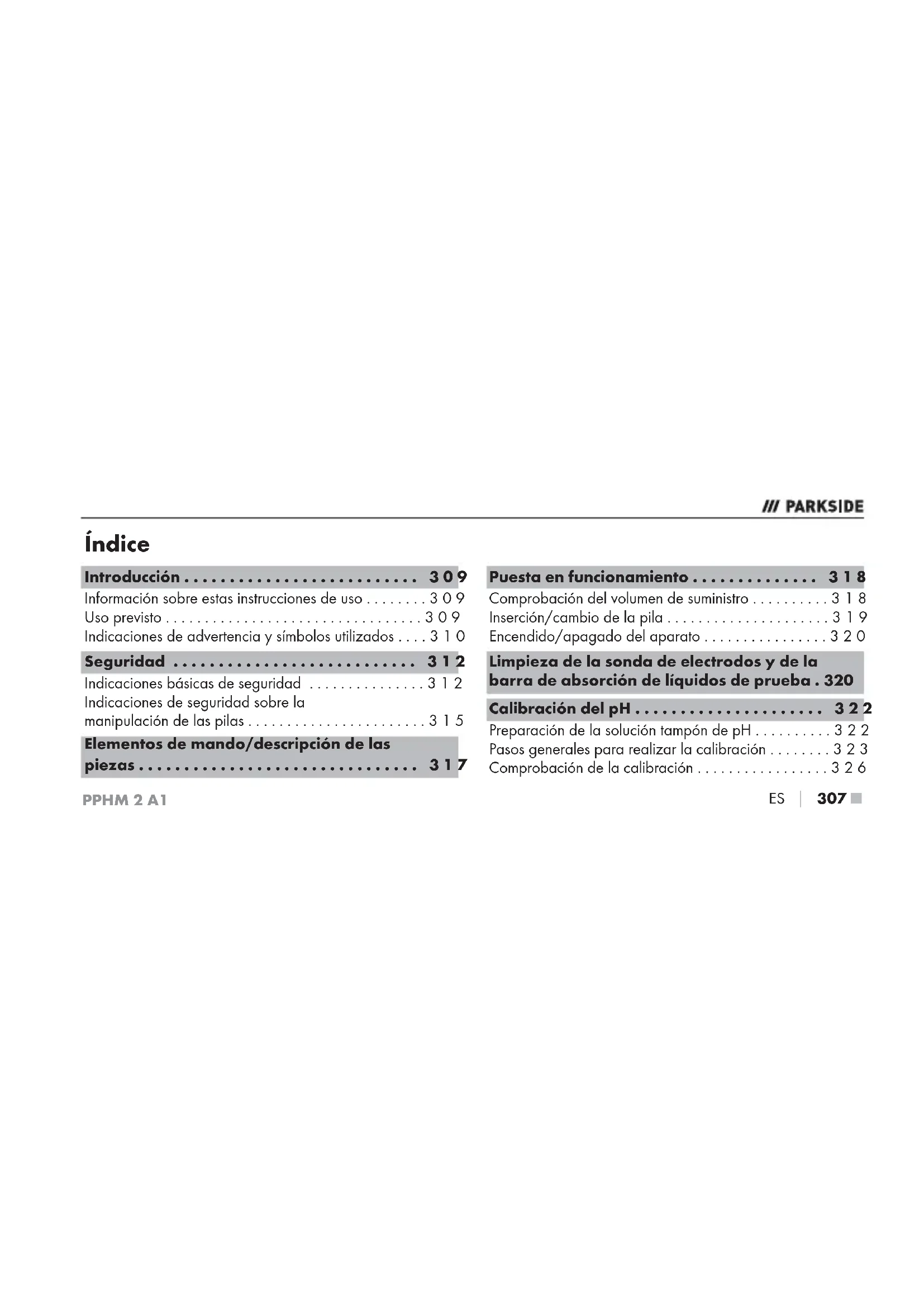 309 ■ Introducción Información sobre estas instrucciones de uso Felicidades por la compra de su aparato nuevo. Ha adquirido un aparato de alta calidad. Las instrucciones de uso forman parte del aparato y contienen indicaciones importantes acerca de su seguridad, uso y desecho. Antes de usar el aparato, familiarícese con todas las indicaciones de manejo y de seguridad. Utilice el aparato exclusivamente de la manera descrita y para los ámbitos de aplicación indicados. Guarde siempre las instrucciones de uso cerca del aparato para poder utilizarlas como material de consulta. Entregue todos los documentos, incluidas estas instrucciones de uso, cuando transfiera o venda el aparato a terceros. Uso previsto Este aparato está previsto exclusivamente para la medición del pH y de la temperatura del agua potable, del agua de acuarios y piscinas, de la leche, de la cerveza y de otros líquidos similares en estancias interiores. IB_434249_PPHM14A1_LB8.indb 309 09.11.2023 13:48:15PPHM 2 A1