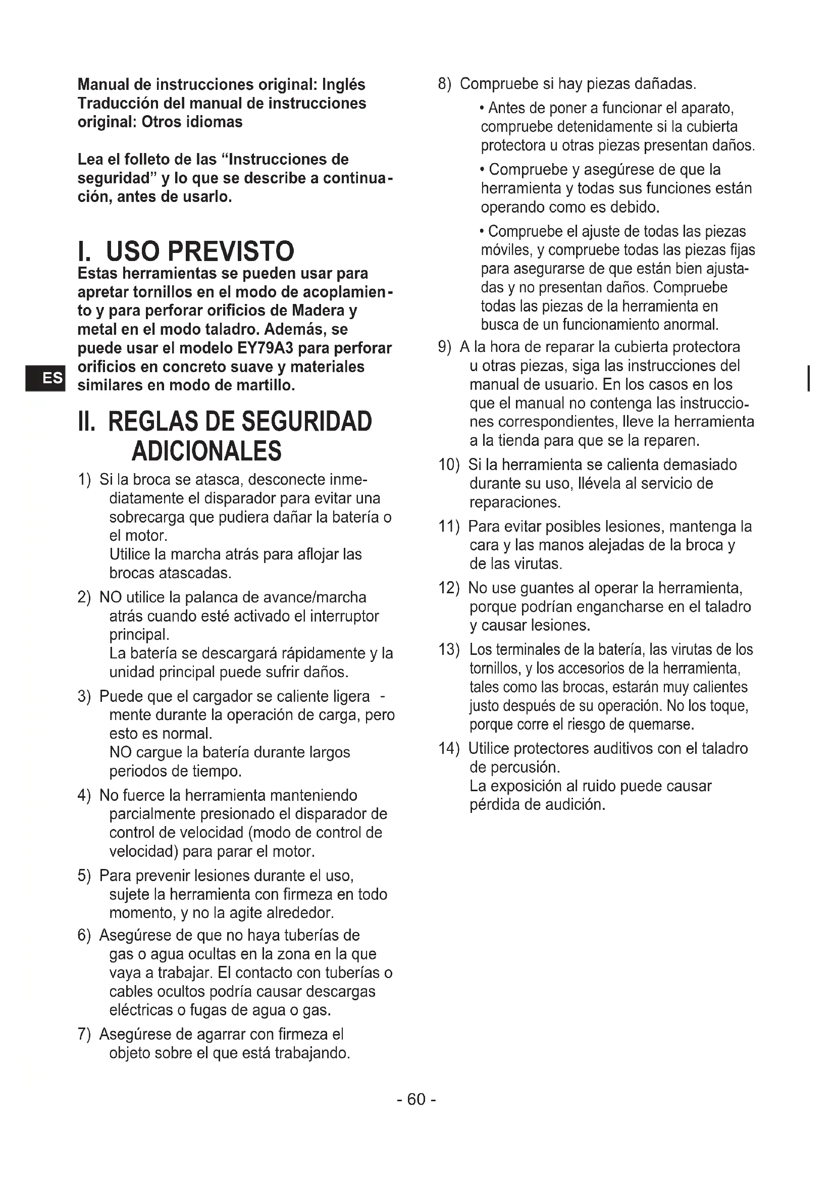 N.º de modelo EY74A3 EY79A3 Voltaje del motor 14,4 V DC 18 V DC 14,4 V DC 18 V DC Apriete de tornillo Tornillo de máquina M5 Tornillo para madera Φ 6,8 mm Φ 8 mm Φ 6,8 mm Φ 8 mm Taladrado Tornillo autorroscante Φ 6 mm Para madera Φ 35 mm Φ 38 mm Φ 35 mm Φ 38 mm Para metal Φ 13 mm Para albañilería — Φ 13 mm INFORMACIÓN ADICIONAL SOBRE LA GARANTÍA La rotura y los daños provocados por un uso continuado durante un periodo de tiempo prolongado (por ejemplo trabajos en líneas de montaje de fábricas, etc.) no están cubiertos por la garantía.- 69 -