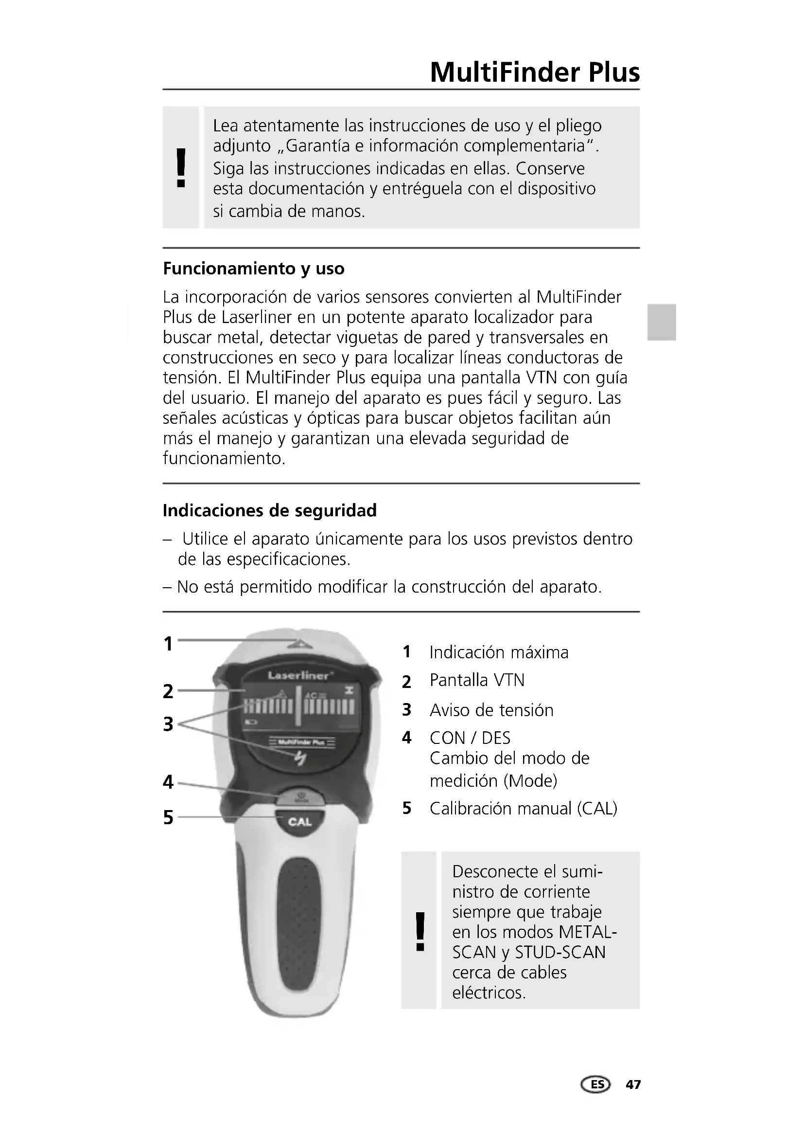 Indicación máxima Pantalla VTN Aviso de tensión CON / DES Cambio del modo de medición (Mode) Calibración manual (CAL) La incorporación de varios sensores convierten al MultiFinder Plus de Laserliner en un potente aparato localizador para buscar metal, detectar viguetas de pared y transversales en construcciones en seco y para localizar líneas conductoras de tensión. El MultiFinder Plus equipa una pantalla VTN con guía del usuario. El manejo del aparato es pues fácil y seguro. Las señales acústicas y ópticas para buscar objetos facilitan aún más el manejo y garantizan una elevada seguridad de funcionamiento. Funcionamiento y uso Lea atentamente las instrucciones de uso y el pliego adjunto „Garantía e información complementaria“. Siga las instrucciones indicadas en ellas. Conserve esta documentación y entréguela con el dispositivo si cambia de manos.