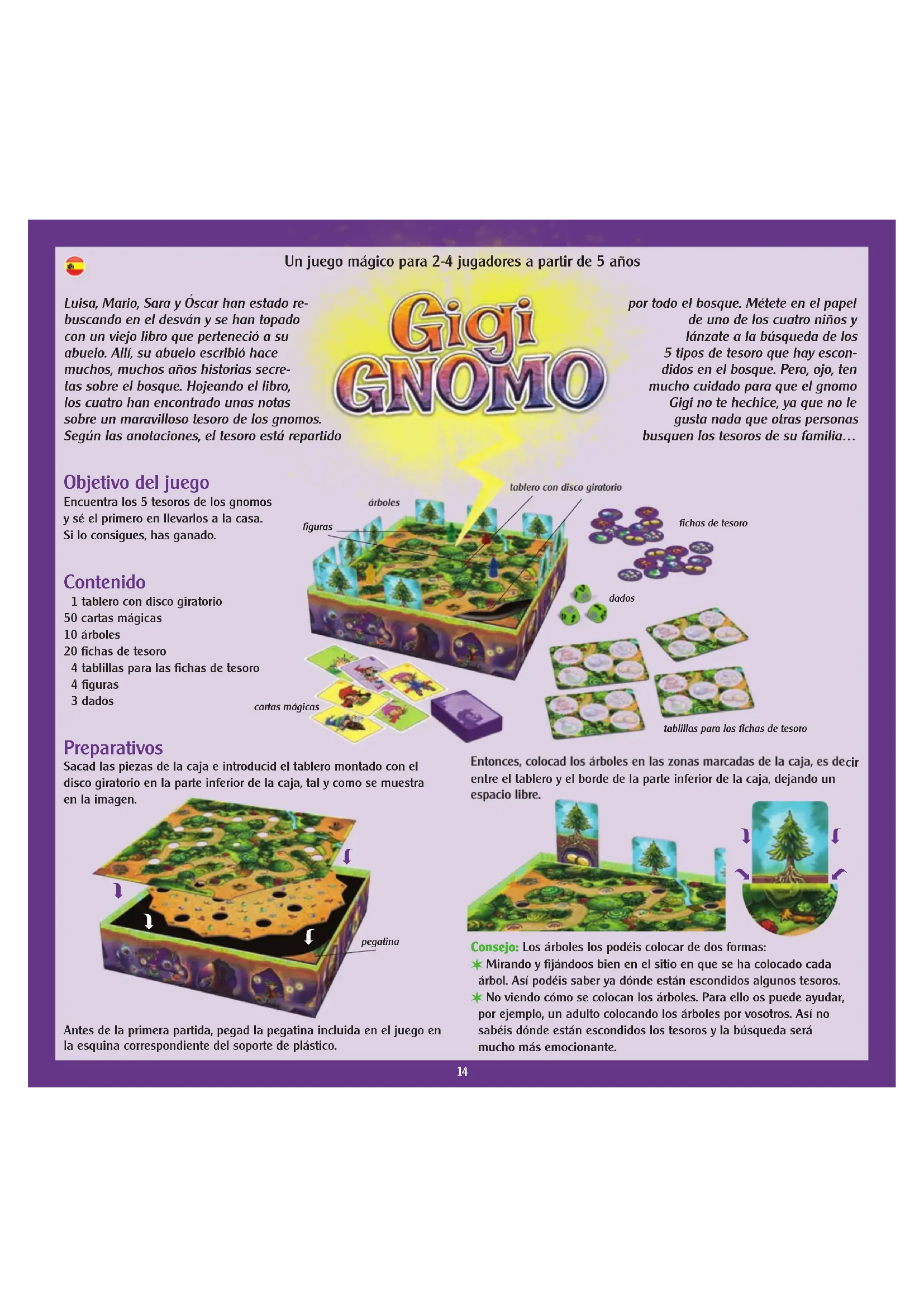 tablero con disco giratorio cartas mágicasárbolesfichas de tesoro tablillas para las fichas de tesorodadosLuisa, Mario, Sara y Óscar han estado re-buscando en el desván y se han topado con un viejo libro que perteneció a su abuelo. Allí, su abuelo escribió hace muchos, muchos años historias secre-tas sobre el bosque. Hojeando el libro, los cuatro han encontrado unas notas sobre un maravilloso tesoro de los gnomos. Según las anotaciones, el tesoro está repartido Objetivo del juego Encuentra los 5 tesoros de los gnomos y sé el primero en llevarlos a la casa. Si lo consigues, has ganado. Contenido 1 tablero con disco giratorio 50 cartas mágicas10 árboles20 fichas de tesoro 4 tablillas para las fichas de tesoro 4 figuras 3 dadospor todo el bosque. Métete en el papel de uno de los cuatro niños y lánzate a la búsqueda de los 5 tipos de tesoro que hay escon-didos en el bosque. Pero, ojo, ten mucho cuidado para que el gnomo Gigi no te hechice, ya que no le gusta nada que otras personas busquen los tesoros de su familia… Un juego mágico para 2-4 jugadores a partir de 5 años pegatinafiguras15 Colocad las fichas de tesoro y los dados junto al tablero del juego.Barajad las cartas mágicas y colocadlas en un mazo boca abajo de tal forma que queden a mano de todos los jugadores. Cada jugador toma una tablilla y la coloca a su lado. Ahora, cada jugador puede elegir una figura y colocarla sobre el tablero en la casilla de salida.Ahora, ya podéis empezar a jugar. Desarrollo del juego Se juega en el sentido de las agujas del reloj. El jugador que haya estado hace menos en un bosque empieza tirando los tres dados. ¿Ves huellas de pies en los dados?Entonces, puedes mover tu figura y avanzar tantas casillas como huellas de pies tengas en los tres dados. Si no quieres avanzar to-das las casillas, también puedes pararte an-tes, pero siempre tienes que avanzar por lo menos una casilla. Las figuras se mueven siempre hacia delante, nunca hacia atrás. ¡ATENCIÓN! Al avanzar, las casillas y los hoyos en los que están las figuras de otros compañeros no se cuentan, sino que se saltan.La casilla en la que te quedes muestra un tesoro. Ahora, tienes que encontrarlo sacando un árbol del borde de la parte inferior de la caja.¿Muestra el árbol que has sacado el mismo tesoro que el de la casilla en la que estás?¡Bien hecho! Has encontrado el tesoro de tu casilla. Si todavía no tienes ninguna ficha de ese tesoro, puedes llevártelo de la reserva de fichas de tesoro y colocarla en tu tablilla. Ten en cuenta que de cada tipo de tesoro solo puedes tener una ficha. Si ya tienes la ficha de ese tesoro y estás hechi zado, puedes librarte del hechizo con esta ficha. Las reglas de los hechizos te las explicaremos después en el apartado sobre los remolinos. Coloca ahora la carta del hechizo junto al mazo de cartas mágicas. Ahí se irá formando durante el juego un mazo de cartas descartadas.Ahora, tienes que volver a poner el árbol en la caja, pero no en el mismo sitio del que lo has sacado, sino en el sitio que estaba libre al principio de tu jugada. ¡OJO¡ Los árboles cambian de sitio siempre que se encuentra el tesoro correspondiente.¿El árbol que has sacado no muestra el mismo tesoro que el de la casilla en la que estás?¡Qué pena! No has encontrado el tesoro de tu casilla. Ahora, coloca el árbol en el mismo sitio del que lo has sacado. ¿Ves remolinos en los dados?Si has movido tu figura o no has tirado ningún dado con huellas de pies, entonces, comprueba si tienes remolinos entre tus dados. Si no tienes ningún remolino, el turno pasa al siguiente jugador. En cambio, si tienes uno o más remolinos en los dados que has tirado, entonces mueve el disco giratorio una posición por cada remolino que tengas siguiendo siempre la dirección marcada por la flecha. Gira el disco lo más rápido que puedas, pero manteniendo un ritmo constante y deja inmediatamente de girarlo en cuanto alguna figura caiga a un hoyo. Los remolinos no utilizados se pierden y no se acumulan.Así se gira el disco. Todas las figuras hundidas en un hoyo han caído en las redes del gnomo Gigi. ¡Vaya mala suerte! El gnomo Gigi los va a hechizar. Por eso, todos los jugadores, cuyas figuras hayan caído a los hoyos del bosque, roban una carta del mazo de cartas mágicas. En estas cartas es donde se muestra el hechizo del gnomo Gigi.Casilla de salidaCasilla