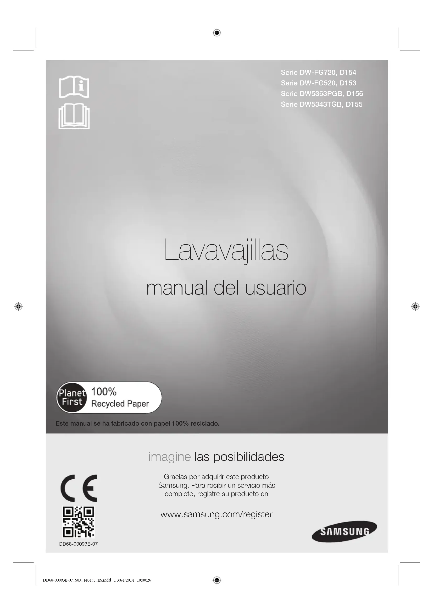 Serie DW-FG720, D154 Serie DW-FG520, D153 Serie DW5363PGB, D156 Serie DW5343TGB, D155 Lavavajillas manual del usuario Este manual se ha fabricado con papel 100% reciclado. imagine las posibilidades Gracias por adquirir este producto Samsung. Para recibir un servicio más completo, registre su producto en www.samsung.com/register DD68-00093E-07_S03_140430_ES.indd 1 30/4/2014 10:00:26DD68-00093E-072_ Características de su nuevo lavavajillas Samsung Características de su nuevo lavavajillas Samsung Con este nuevo lavavajillas, fregar los utensilios de cocina será muy distinto. Desde sus características especiales hasta su eficiencia energética, este nuevo lavavajillas Samsung asegura que lavar la vajilla sea lo más fácil y agradable posible.