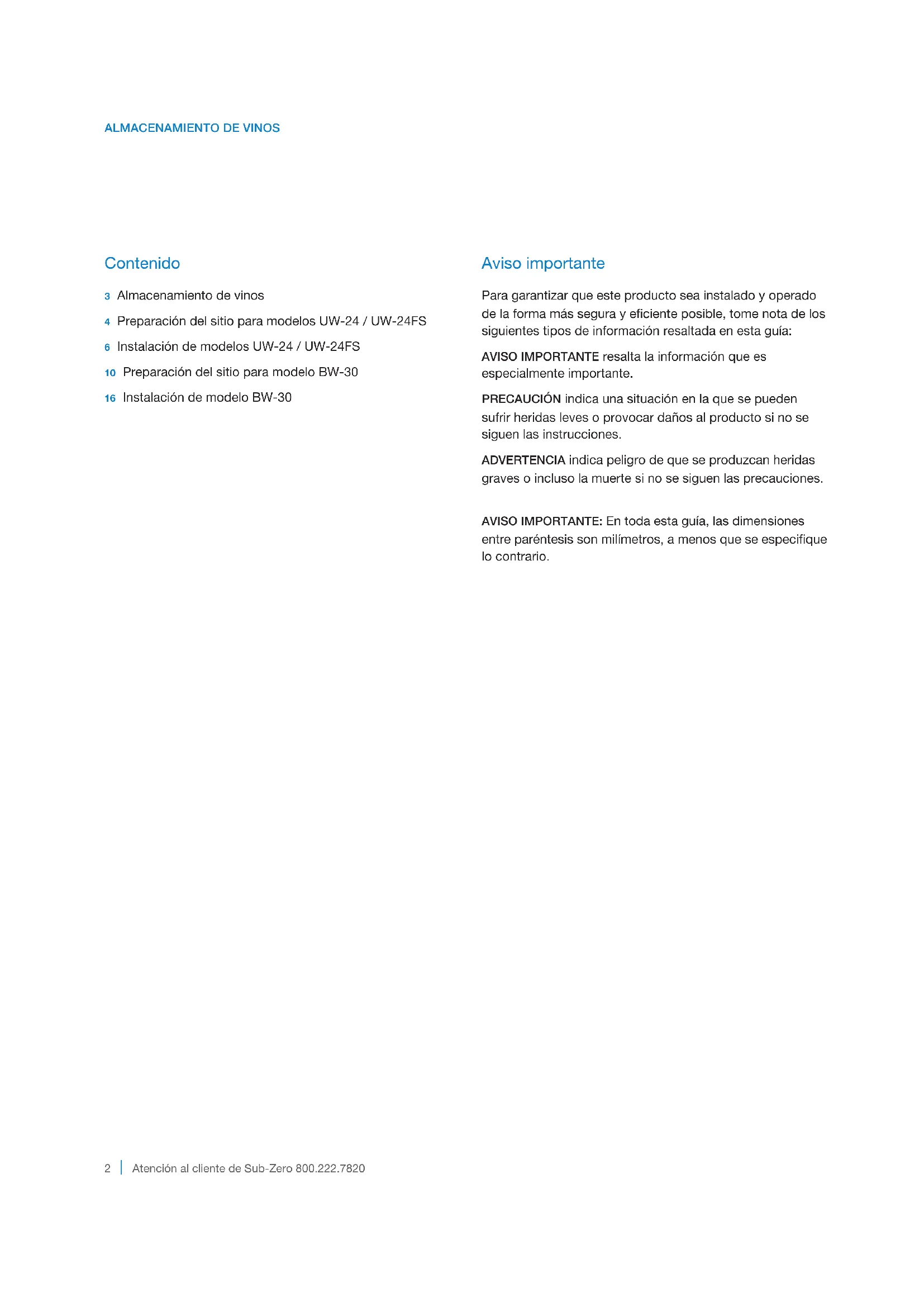 Contenido 3 Almacenamiento de vinos4 Preparación del sitio para modelos UW-24 / UW-24FS6 Instalación de modelos UW-24 / UW-24FS10 Preparación del sitio para modelo BW-3016 Instalación de modelo BW-30 Aviso importante Para garantizar que este producto sea instalado y operado de la forma más segura y eciente posible, tome nota de los siguientes tipos de información resaltada en esta guía: AVISO IMPORTANTE resalta la información que es especialmente importante. PRECAUCIÓN indica una situación en la que se pueden sufrir heridas leves o provocar daños al producto si no se siguen las instrucciones. ADVERTENCIA indica peligro de que se produzcan heridas graves o incluso la muerte si no se siguen las precauciones. AVISO IMPORTANTE: En toda esta guía, las dimensiones entre paréntesis son milímetros, a menos que se especique lo contrario.subzero.com