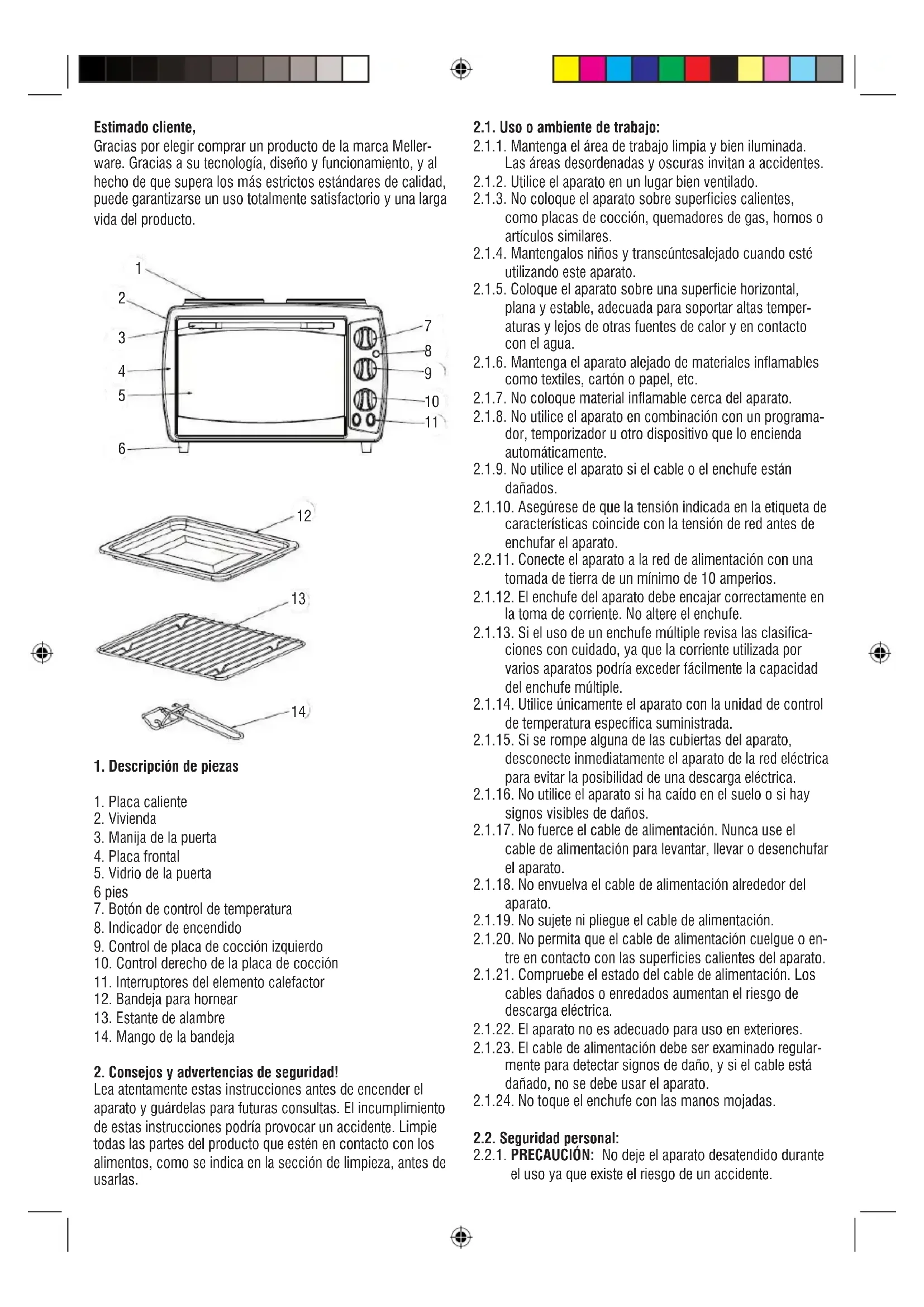 Lea atentamente estas instrucciones antes de encender el aparato y guárdelas para futuras consultas. El incumplimiento de estas instrucciones podría provocar un accidente. Limpie todas las partes del producto que estén en contacto con los alimentos, como se indica en la sección de limpieza, antes de usarlas. 2.1. Uso o ambiente de trabajo: