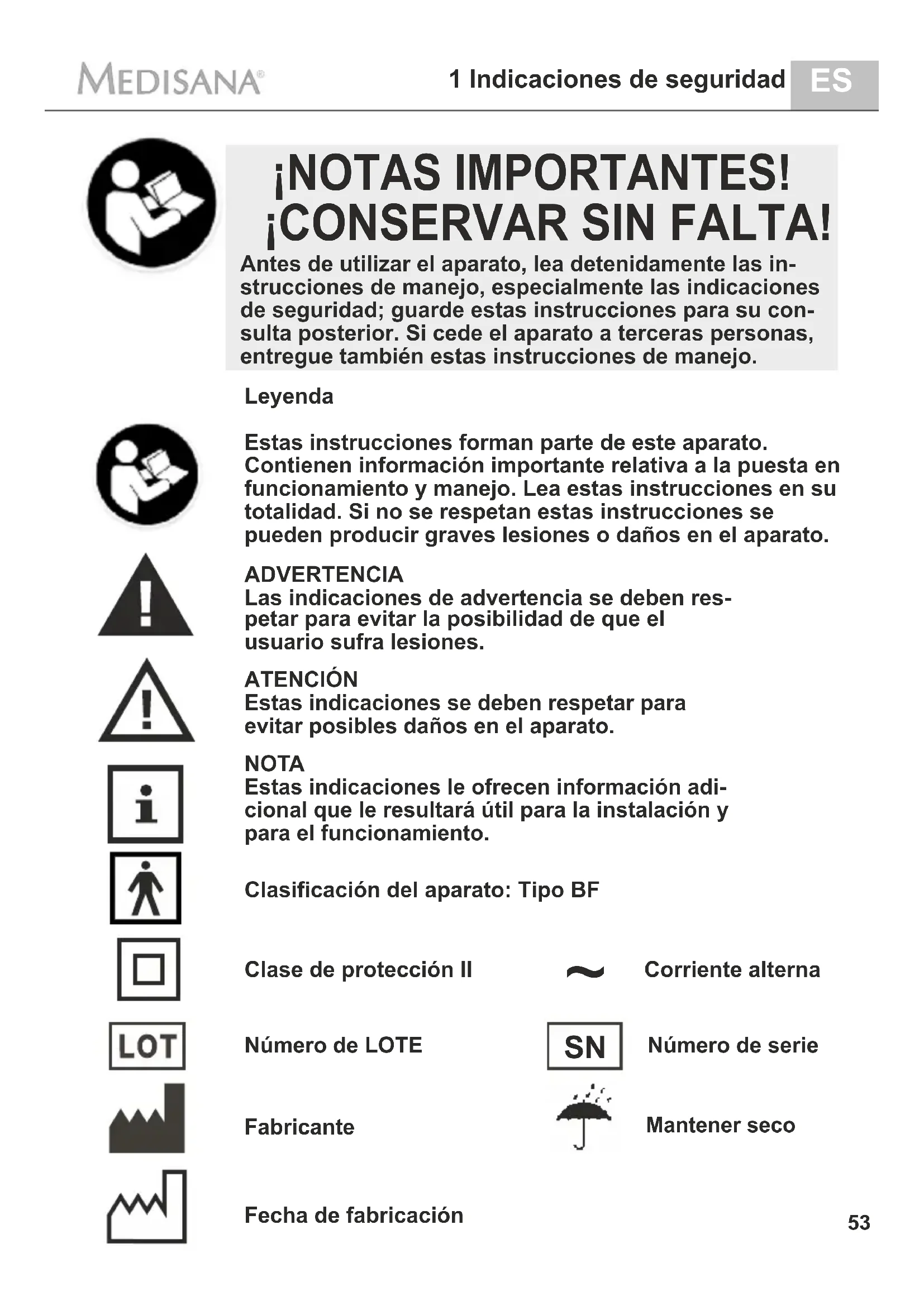 Estas instrucciones forman parte de este aparato. Contienen información importante relativa a la puesta en funcionamiento y manejo. Lea estas instrucciones en su totalidad. Si no se respetan estas instrucciones se pueden producir graves lesiones o daños en el aparato.ADVERTENCIALas indicaciones de advertencia se deben res-petar para evitar la posibilidad de que el usuario sufra lesiones.ATENCIÓNEstas indicaciones se deben respetar para evitar posibles daños en el aparato. NOTA Estas indicaciones le ofrecen información adi-cional que le resultará útil para la instalación y para el funcionamiento. Número de LOTE Número de serie FabricanteLeyenda Clasificación del aparato: Tipo BFClase de protección II Corriente alternaFecha de fabricación ¡NOTAS IMPORTANTES! ¡CONSERVAR SIN FALTA! Antes de utilizar el aparato, lea detenidamente las in-strucciones de manejo, especialmente las indicaciones de seguridad; guarde estas instrucciones para su con-sulta posterior. Si cede el aparato a terceras personas, entregue también estas instrucciones de manejo.