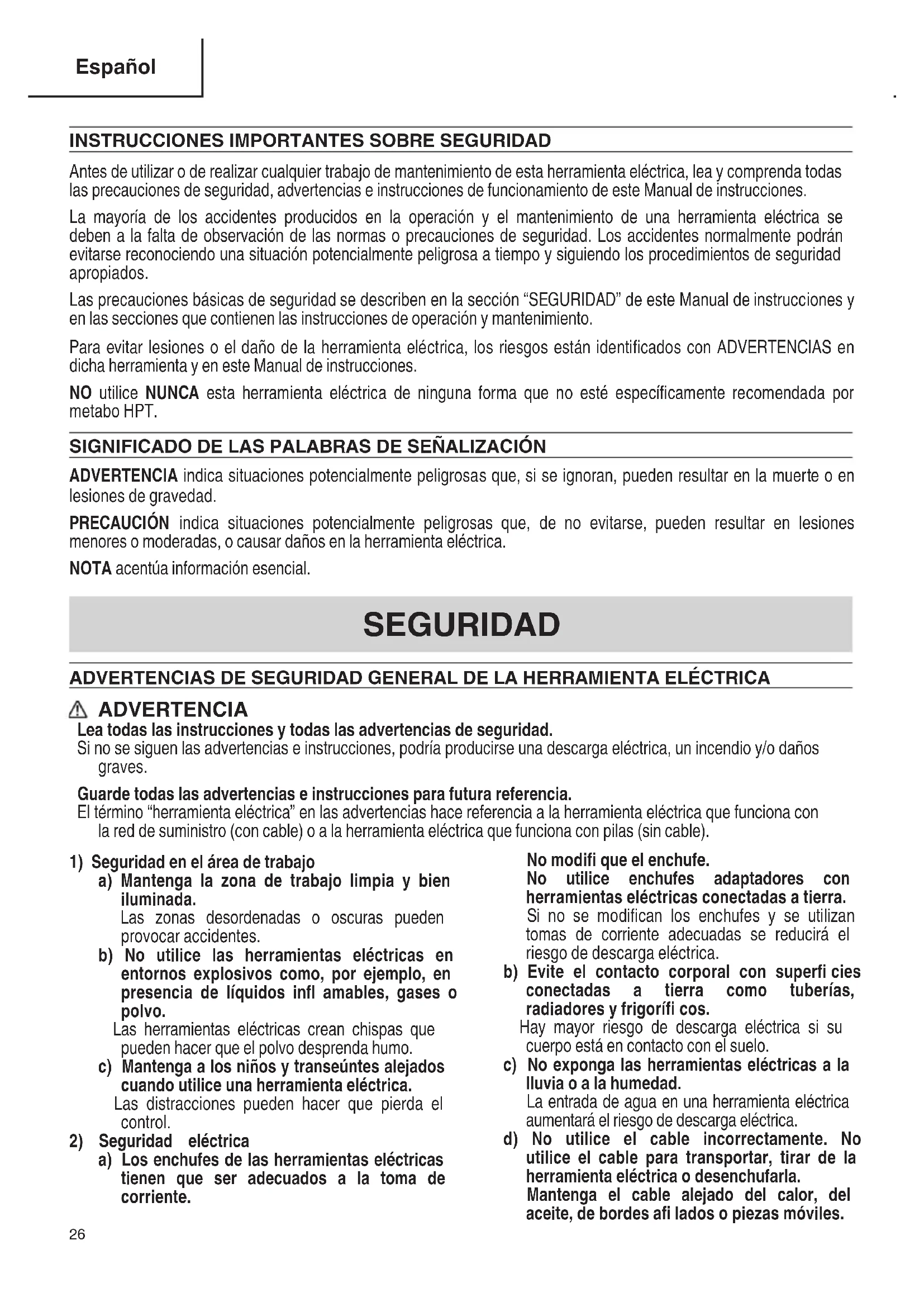 Antes de utilizar o de realizar cualquier trabajo de mantenimiento de esta herramienta eléctrica, lea y comprenda todas las precauciones de seguridad, advertencias e instrucciones de funcionamiento de este Manual de instrucciones. La mayoría de los accidentes producidos en la operación y el mantenimiento de una herramienta eléctrica se deben a la falta de observación de las normas o precauciones de seguridad. Los accidentes normalmente podrán evitarse reconociendo una situación potencialmente peligrosa a tiempo y siguiendo los procedimientos de seguridad apropiados. Las precauciones básicas de seguridad se describen en la sección “SEGURIDAD” de este Manual de instrucciones y en las secciones que contienen las instrucciones de operación y mantenimiento. Para evitar lesiones o el daño de la herramienta eléctrica, los riesgos están identifi cados con ADVERTENCIAS en dicha herramienta y en este Manual de instrucciones. NO utilice NUNCA esta herramienta eléctrica de ninguna forma que no esté específi camente recomendada por metabo HPT. SIGNIFICADO DE LAS PALABRAS DE SEÑALIZACIÓN ADVERTENCIA indica situaciones potencialmente peligrosas que, si se ignoran, pueden resultar en la muerte o en lesiones de gravedad. PRECAUCIÓN indica situaciones potencialmente peligrosas que, de no evitarse, pueden resultar en lesiones menores o moderadas, o causar daños en la herramienta eléctrica. NOTA acentúa información esencial. SEGURIDAD ADVERTENCIAS DE SEGURIDAD GENERAL DE LA HERRAMIENTA ELÉCTRICA ADVERTENCIA Lea todas las instrucciones y todas las advertencias de seguridad. Si no se siguen las advertencias e instrucciones, podría producirse una descarga eléctrica, un incendio y/o daños graves. Guarde todas las advertencias e instrucciones para futura referencia. El término “herramienta eléctrica” en las advertencias hace referencia a la herramienta eléctrica que funciona con la red de suministro (con cable) o a la herramienta eléctrica que funciona con pilas (sin cable).