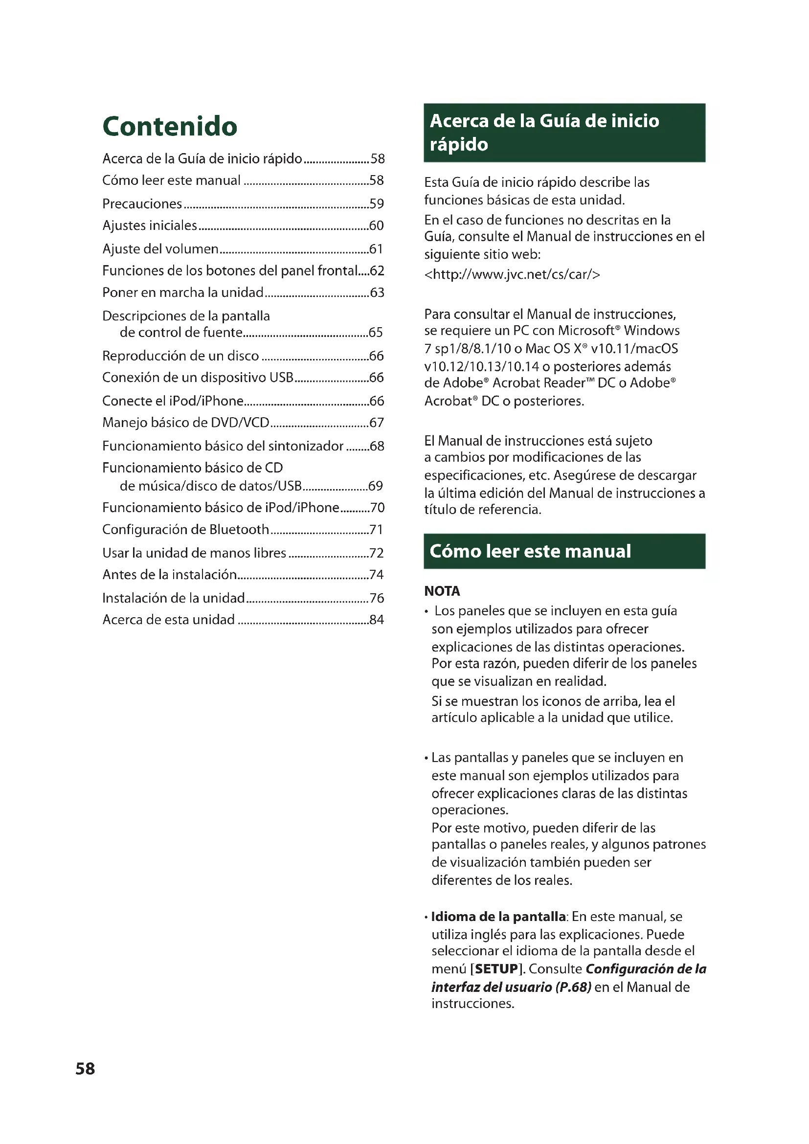 - Général Impédance de haut-parleur : 4 – 8 Ω Tension de fonctionnement : Batterie de voiture 12 V CC58 Acerca de la Guía de inicio rápido ...................... 58 Cómo leer este manual ..........................................58 Precauciones ..............................................................59 Ajustes iniciales .........................................................60 Ajuste del volumen ..................................................61 Funciones de los botones del panel frontal....62 Poner en marcha la unidad ................................... 63 Descripciones de la pantalla de control de fuente..........................................65 Reproducción de un disco ....................................66 Conexión de un dispositivo USB .........................66 Conecte el iPod/iPhone..........................................66 Manejo básico de DVD/VCD ................................. 67 Funcionamiento básico del sintonizador ........68 Funcionamiento básico de CD de música/disco de datos/USB ......................69 Funcionamiento básico de iPod/iPhone ..........70 Configuración de Bluetooth .................................71 Usar la unidad de manos libres ...........................72 Antes de la instalación ............................................74 Instalación de la unidad ......................................... 76 Acerca de esta unidad ............................................84 Acerca de la Guía de inicio rápido Esta Guía de inicio rápido describe las funciones básicas de esta unidad. En el caso de funciones no descritas en la Guía, consulte el Manual de instrucciones en el siguiente sitio web: <http://www.jvc.net/cs/car/> Para consultar el Manual de instrucciones, se requiere un PC con Microsoft® Windows 7 sp1/8/8.1/10 o Mac OS X® v10.11/macOS v10.12/10.13/10.14 o posteriores además de Adobe® Acrobat Reader™ DC o Adobe® Acrobat® DC o posteriores. El Manual de instrucciones está sujeto a cambios por modificaciones de las especificaciones, etc. Asegúrese de descargar la última edición del Manual de instrucciones a título de referencia. Cómo leer este manual NOTA
