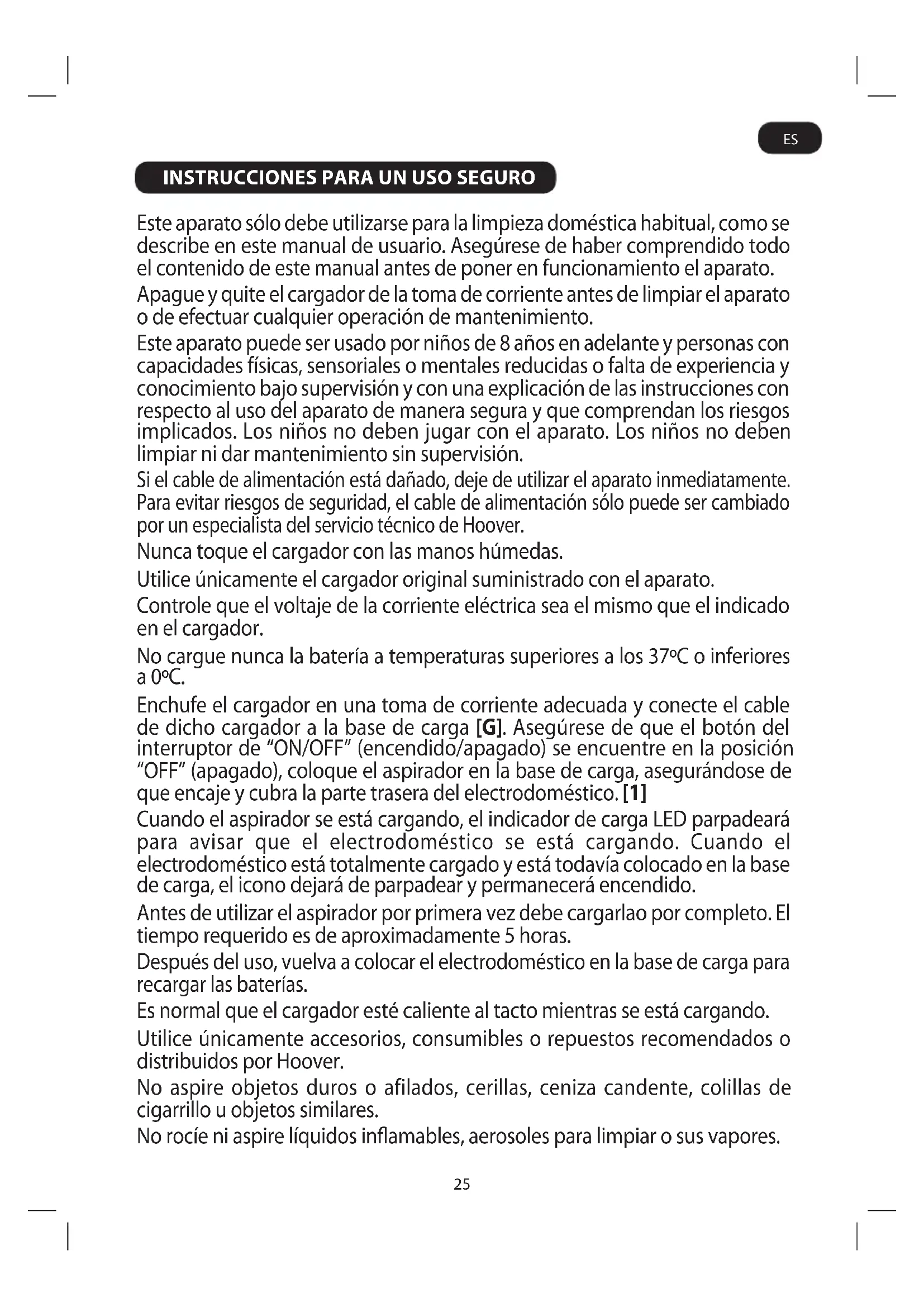 Este aparato sólo debe utilizarse para la limpieza doméstica habitual, como se describe en este manual de usuario. Asegúrese de haber comprendido todo el contenido de este manual antes de poner en funcionamiento el aparato. Apague y quite el cargador de la toma de corriente antes de limpiar el aparato o de efectuar cualquier operación de mantenimiento. Este aparato puede ser usado por niños de 8 años en adelante y personas con capacidades físicas, sensoriales o mentales reducidas o falta de experiencia y conocimiento bajo supervisión y con una explicación de las instrucciones con respecto al uso del aparato de manera segura y que comprendan los riesgos implicados. Los niños no deben jugar con el aparato. Los niños no deben limpiar ni dar mantenimiento sin supervisión. Si el cable de alimentación está dañado, deje de utilizar el aparato inmediatamente. Para evitar riesgos de seguridad, el cable de alimentación sólo puede ser cambiado por un especialista del servicio técnico de Hoover. Nunca toque el cargador con las manos húmedas. Utilice únicamente el cargador original suministrado con el aparato. Controle que el voltaje de la corriente eléctrica sea el mismo que el indicado en el cargador. No cargue nunca la batería a temperaturas superiores a los 37ºC o inferiores a 0ºC. Enchufe el cargador en una toma de corriente adecuada y conecte el cable de dicho cargador a la base de carga [G]. Asegúrese de que el botón del interruptor de “ON/OFF” (encendido/apagado) se encuentre en la posición “OFF” (apagado), coloque el aspirador en la base de carga, asegurándose de que encaje y cubra la parte trasera del electrodoméstico. [1] Cuando el aspirador se está cargando, el indicador de carga LED parpadeará para avisar que el electrodoméstico se está cargando. Cuando el electrodoméstico está totalmente cargado y está todavía colocado en la base de carga, el icono dejará de parpadear y permanecerá encendido. Antes de utilizar el aspirador por primera vez debe cargarlao por completo. El tiempo requerido es de aproximadamente 5 horas. Después del uso, vuelva a colocar el electrodoméstico en la base de carga para recargar las baterías. Es normal que el cargador esté caliente al tacto mientras se está cargando. Utilice únicamente accesorios, consumibles o repuestos recomendados o distribuidos por Hoover. No aspire objetos duros o afilados, cerillas, ceniza candente, colillas de cigarrillo u objetos similares. No rocíe ni aspire líquidos inamables, aerosoles para limpiar o sus vapores. ES26