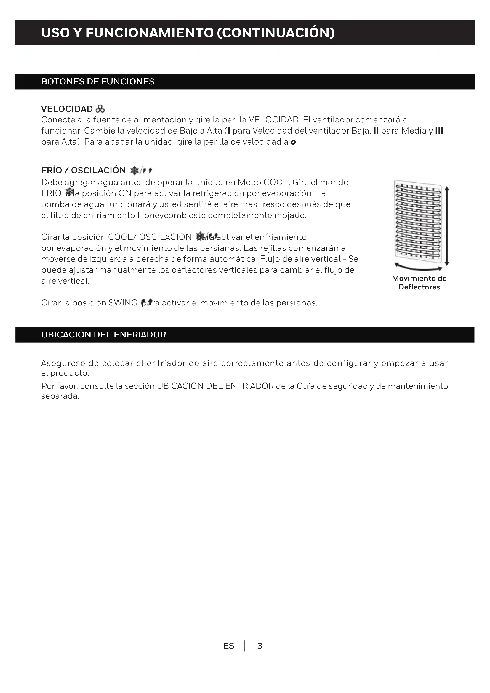 Asegúrese de colocar el enfriador de aire correctamente antes de configurar y empezar a usar el producto. Por favor, consulte la sección UBICACION DEL ENFRIADOR de la Guía de seguridad y de mantenimiento separada. Movimiento de Deflectores4