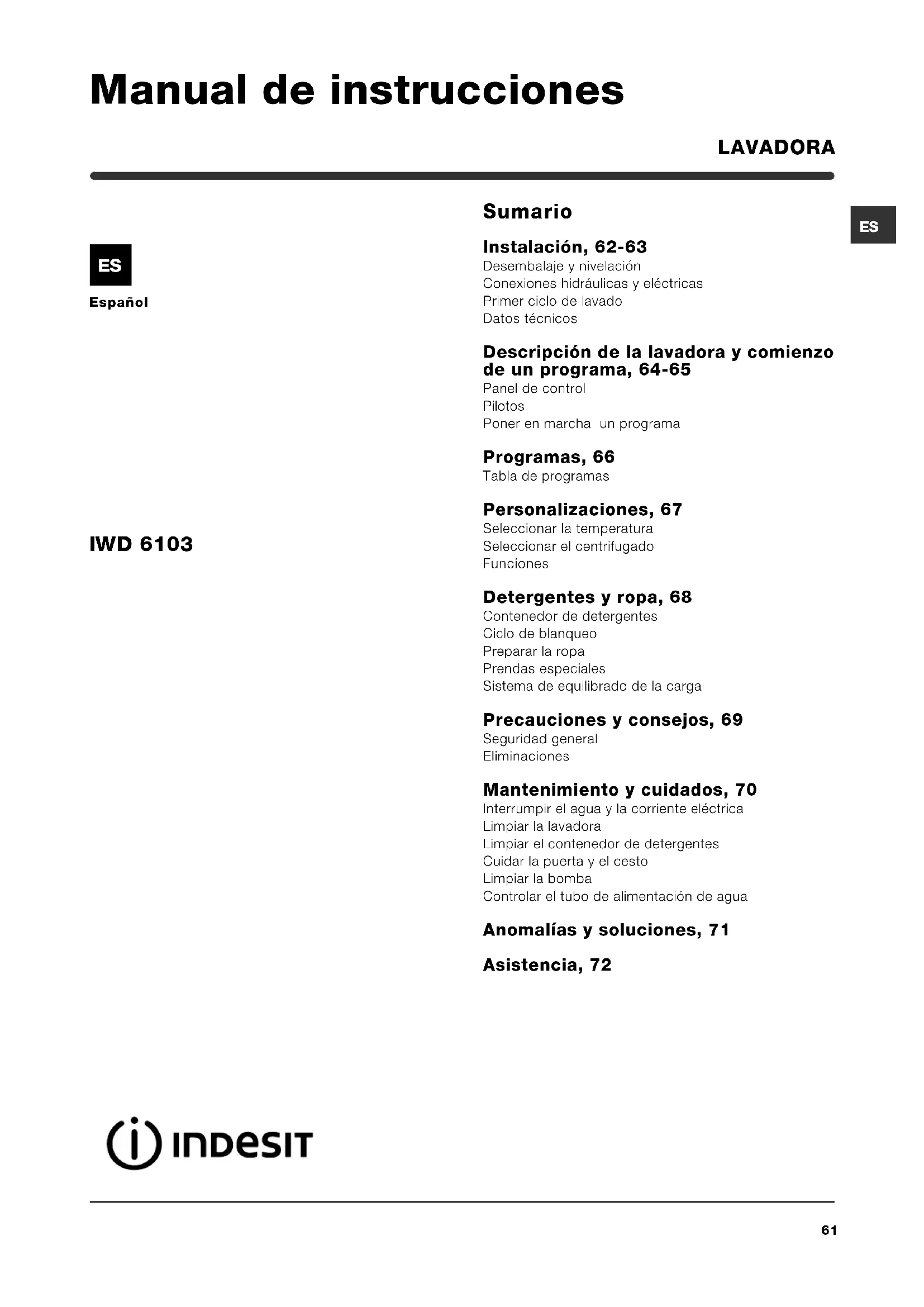 Español Sumario Instalación, 62-63 Desembalaje y nivelación Conexiones hidráulicas y eléctricas Primer ciclo de lavado Datos técnicos Descripción de la lavadora y comienzo de un programa, 64-65 Panel de control Pilotos Poner en marcha un programa Programas, 66 Tabla de programas Personalizaciones, 67 Seleccionar la temperatura Seleccionar el centrifugado Funciones Detergentes y ropa, 68 Contenedor de detergentes Ciclo de blanqueo Preparar la ropa Prendas especiales Sistema de equilibrado de la carga Precauciones y consejos, 69 Seguridad general Eliminaciones Mantenimiento y cuidados, 70 Interrumpir el agua y la corriente eléctrica Limpiar la lavadora Limpiar el contenedor de detergentes Cuidar la puerta y el cesto Limpiar la bomba Controlar el tubo de alimentación de agua Anomalías y soluciones, 71 Asistencia, 72