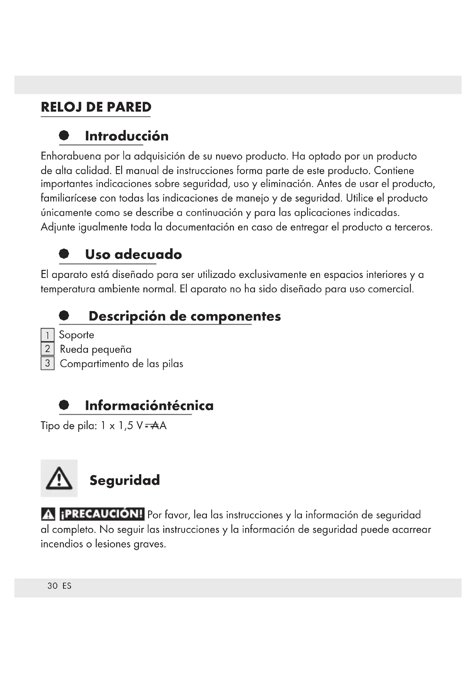 Compartimento de las pilas § Información técnica Tipo de pila: 1 x 1,5 V AA Seguridad Por favor, lea las instrucciones y la información de seguridad al completo. No seguir las instrucciones y la información de seguridad puede acarrear incendios o lesiones graves.31 ES Información general de seguridad