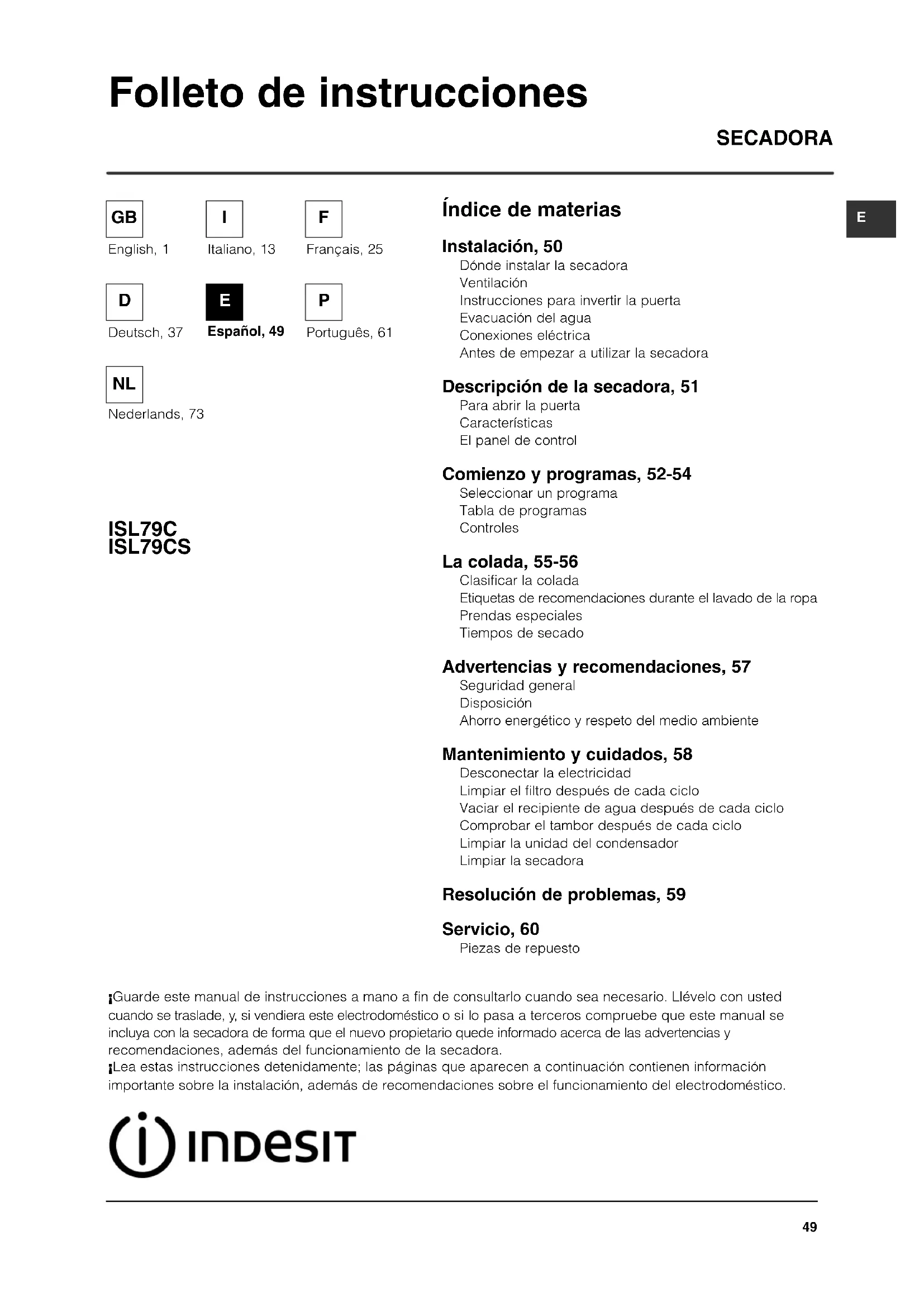 Für Vergleichstests gemäß EN61121 empfohlene Programme ! Hinweis: Hierbei handelt es sich nicht um eine vollständige Liste aller Programmoptionen (siehe Start und Programme). Programm Auszuwählendes Programm Ladung (EN61121) Baumwolle trocken 2 Baumwolle - Kleiderbügel trocken 7 kg Baumwolle bügeltrocken 3 Baumwolle - Bügeltrocken 7 kg Pflegeleichtes Gewebe 4 Synthetik - Schranktrocken 3 kg Diese Maschine erfüllt folgende EG-Direktiven: -2006/95/EG (Niederspannungsausrüstung) -89/336/EG, 92/31/EG und 93/68/EG (Elektromagnetische Störfreiheit) 48Índice de materias SECADORA ISL79C ISL79CS Folleto de instrucciones Instalación, 50 Dónde instalar la secadora Ventilación Instrucciones para invertir la puerta Evacuación del agua Conexiones eléctrica Antes de empezar a utilizar la secadora Descripción de la secadora, 51 Para abrir la puerta Características El panel de control Comienzo y programas, 52-54 Seleccionar un programa Tabla de programas Controles La colada, 55-56 Clasificar la colada Etiquetas de recomendaciones durante el lavado de la ropa Prendas especiales Tiempos de secado Advertencias y recomendaciones, 57 Seguridad general Disposición Ahorro energético y respeto del medio ambiente Mantenimiento y cuidados, 58 Desconectar la electricidad Limpiar el filtro después de cada ciclo Vaciar el recipiente de agua después de cada ciclo Comprobar el tambor después de cada ciclo Limpiar la unidad del condensador Limpiar la secadora Resolución de problemas, 59 Servicio, 60 Piezas de repuesto