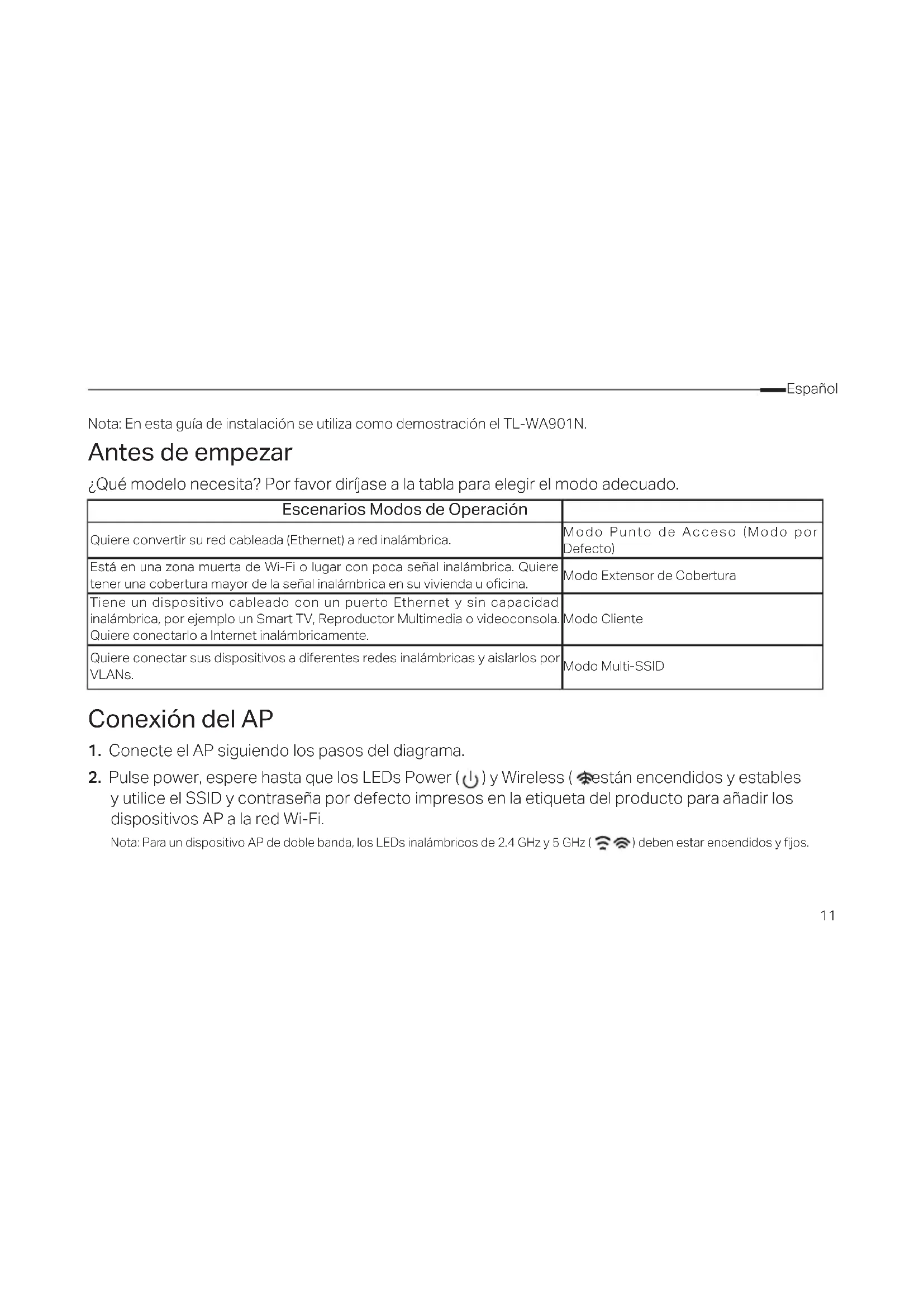 - Move the AP device to a new location away from Bluetooth devices and other household electronics, such as cordless phone, microwave, and baby monitor and more, to minimize signal interference.11 Español Nota: En esta guía de instalación se utiliza como demostración el TL-WA901N. Antes de empezar ¿Qué modelo necesita? Por favor diríjase a la tabla para elegir el modo adecuado. Escenarios Modos de Operación Quiere convertir su red cableada (Ethernet) a red inalámbrica. Modo Punto de Acceso (Modo por Defecto) Está en una zona muerta de Wi-Fi o lugar con poca señal inalámbrica. Quiere tener una cobertura mayor de la señal inalámbrica en su vivienda u ocina. Modo Extensor de Cobertura Tiene un dispositivo cableado con un puerto Ethernet y sin capacidad inalámbrica, por ejemplo un Smart TV, Reproductor Multimedia o videoconsola. Quiere conectarlo a Internet inalámbricamente. Modo Cliente Quiere conectar sus dispositivos a diferentes redes inalámbricas y aislarlos por VLANs. Modo Multi-SSID Conexión del AP