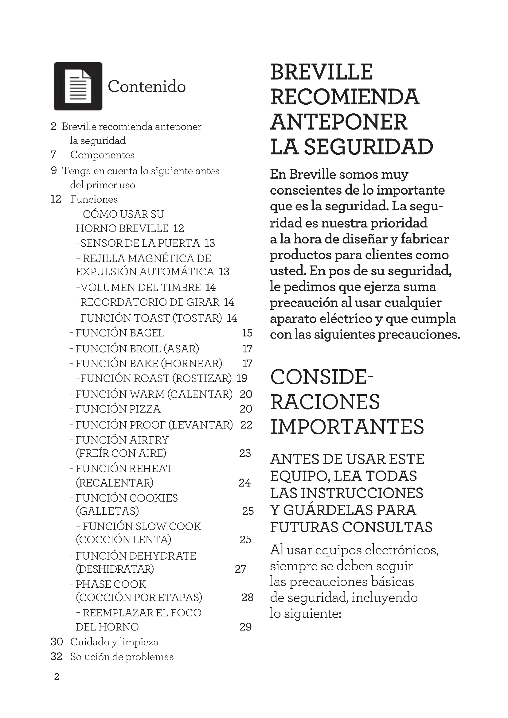 FUTURAS CONSULTAS Al usar equipos electrónicos, siempre se deben seguir las precauciones básicas deseguridad, incluyendo losiguiente: Contenido 2 Breville recomienda anteponer laseguridad7 Componentes9 Tenga en cuenta lo siguiente antes delprimer uso12 Funciones − CÓMO USAR SU HORNO BREVILLE 12 − SENSOR DE LA PUERTA 13 − REJILLA MAGNÉTICA DE EXPULSIÓN AUTOMÁTICA 13 − VOLUMEN DEL TIMBRE 14 − RECORDATORIO DE GIRAR 14 − FUNCIÓN TOAST (TOSTAR) 14