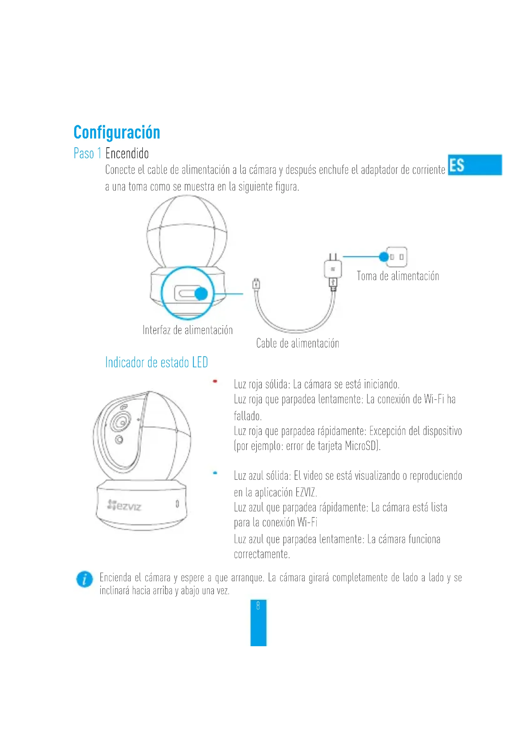 network, it will automatically connect to the same Wi-Fi network.6 Appendix Box Content Camera (x1) Base (x1) Power Cable (x1) Drill Template (x1) Screw Kit (x1) Power Adapter (x1) Quick Start Guide x(1)7 Type A Type B Type LED Indicator Louderspeaker Power Interface Louderspeaker Network Interface Power Interface LED Indicator8 Configuración Paso 1 Encendido Conecte el cable de alimentación a la cámara y después enchufe el adaptador de corriente a una toma como se muestra en la siguiente figura. Interfaz de alimentación Cable de alimentación Toma de alimentación Indicador de estado LED Luz roja sólida: La cámara se está iniciando. Luz roja que parpadea lentamente: La conexión de Wi-Fi ha fallado. Luz roja que parpadea rápidamente: Excepción del dispositivo (por ejemplo: error de tarjeta MicroSD). Luz azul sólida: El video se está visualizando o reproduciendo en la aplicación EZVIZ. Luz azul que parpadea rápidamente: La cámara está lista para la conexión Wi-Fi Luz azul que parpadea lentamente: La cámara funciona correctamente. Encienda el cámara y espere a que arranque. La cámara girará completamente de lado a lado y se inclinará hacia arriba y abajo una vez.9 Ranura para tarjeta microSD/ REINICIAR Paso 2 Configuración de la cámara
