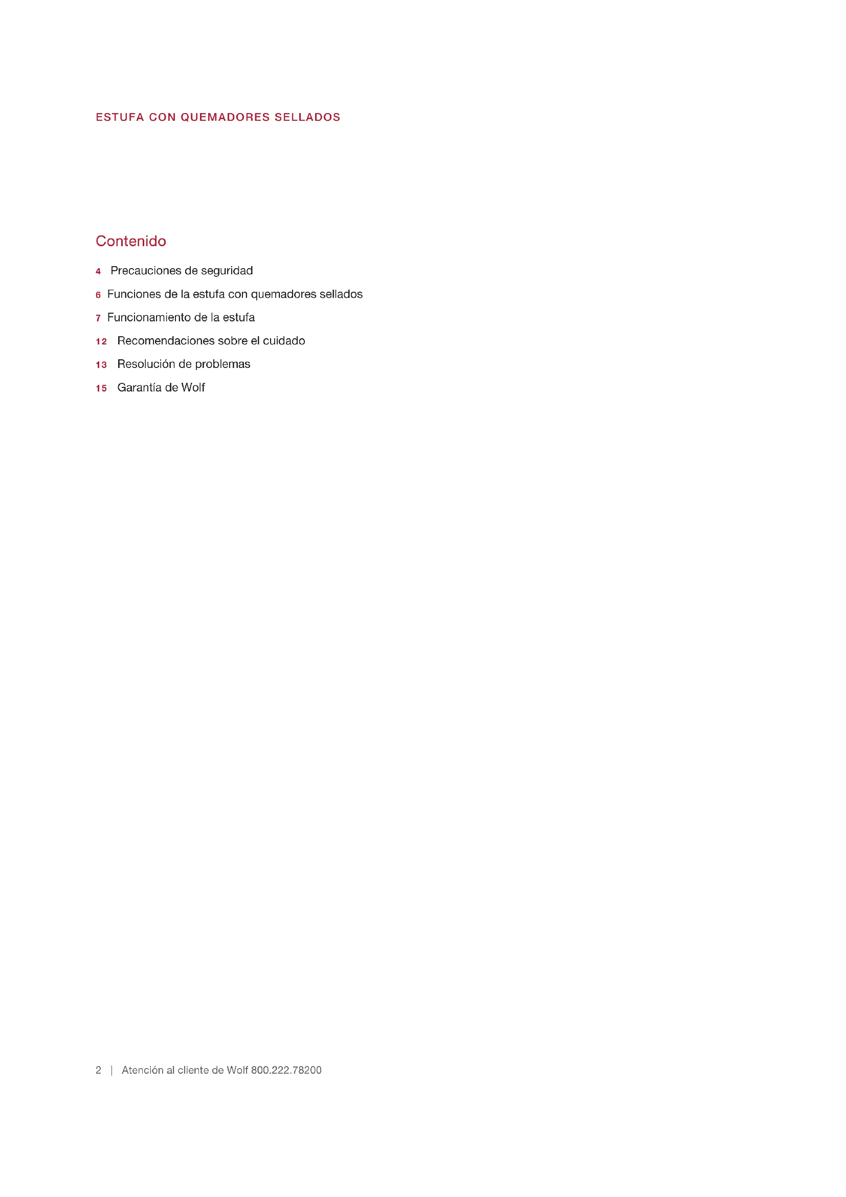 - No almacene materiales ignífugos cerca de los quemadores y tampoco permita la acumulación de grasa u otras sustancias ignífugas en este electro- doméstico.6 | Atención al cliente de Wolf 800.222.78200 Funciones de la estufa con quemadores sellados CARACTERÍSTICAS