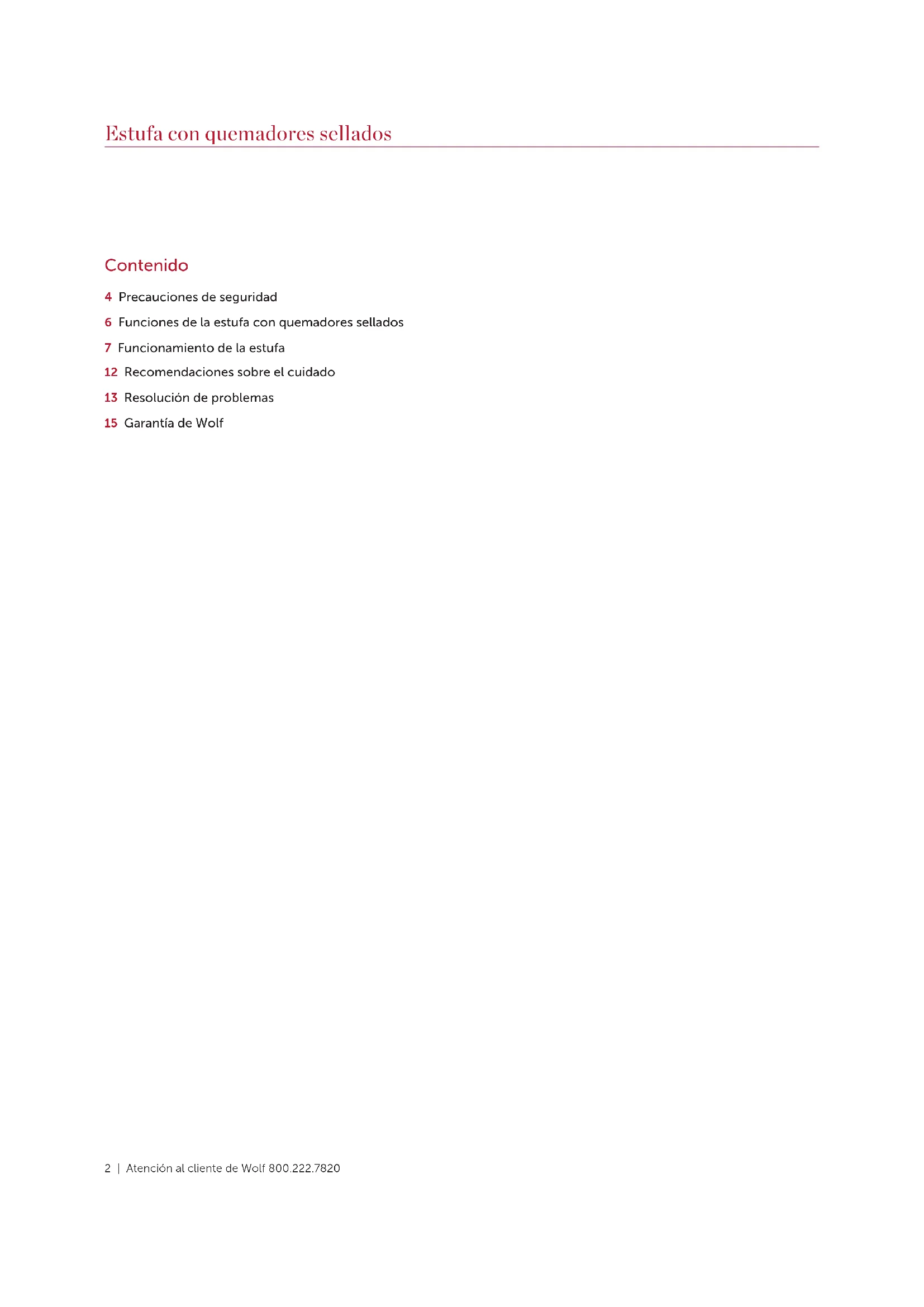 La rejilla del quemador de wok permite que el wok fun- cione como un quemador de superficie grande para ollas de fondo plano de hasta 14" (356) de diámetro. Rejilla de quemador de wok Funcionamiento de la estufa12 | Atención al cliente de Wolf 800.222.7820 Recomendaciones sobre el cuidado Recomendaciones sobre el cuidado LIMPIEZA Acero inoxidable Use un limpiador no abrasivo para acero inoxidable y aplique con un paño suave sin pelusa. Para resaltar el lustre natural, limpie suavemente la superficie con una tela de microfibra humedecida con agua, seguida con una gamuza para pulir en seco. Siempre siga la dirección del acabado del acero inoxidable. Parrillas del quemador Retire y coloque sobre una superficie plana cerca del fregadero. Límpielas con agua caliente y un detergente suave o con pasta de bicarbonato de sodio y agua. No las sumerja en agua. Seque con una toalla. Bandeja del quemador Retire los desechos de la superficie antes de limpiarla para agilizar el proceso de limpieza y disminuir las posibi- lidades de rayar la superficie. Utilizando limpiadores ligeramente abrasivos o desengrasantes en aerosol, limpie y enjuague la superficie y séquela de inmediato para evitar que se raye. Utilice vinagre blanco y agua para limpiar las manchas ocasionadas por el agua con alto contenido de minerales. Enjuague y seque de inmediato. Quemadores superiores Deje enfriar. Límpielos con detergente suave o desengrasante en aerosol. Enjuague con agua y séquelos con una toalla. Parrilla Una vez que termine de cocinar, deje encendida la parrilla durante 10 minutos. El fuego alto ayudará a quemar el exceso de partículas de alimentos. Una vez que la rejilla se enfríe, retírela y colóquela en el fregadero. Cúbrala con toallas de cocina húmedas y vierta agua sobre ella para aflojar los residuos. Limpie con jabón y una almohadilla abrasiva. Enjuague y seque. Para limpiar el marco, retírelo y colóquelo en el fregadero. Remójelo en agua caliente y detergente suave. Lávelo y frótelo con una almohadilla abrasiva. Plancha Raspe la grasa en la bandeja de recolección de grasa después de cada uso. Cuando la superficie se haya enfriado, límpiela con papel absorbente para retirar el exceso de grasa o aceite. Después de cada uso, vuelva a aplicar una pequeña cantidad de aceite de maní o vegetal en una toalla de papel y extienda uniformemente. De vez en cuando, retire la preparación. Vierta ⁄ taza (120 ml) de agua tibia y 1 cucharadita (5 ml) de limpiador para plancha sobre la plancha y raspe la grasa en la bandeja de recolección de grasa, y después vacíela. Una vez que esté seca, vuelva a aplicar una pequeña cantidad de aceite para prepararla. Encimera francesa Limpie toda la superficie después de cada uso cuando aún esté ligeramente caliente. Limpie con detergente suave y agua. Enjuague y seque. Después de cada uso, vuelva a aplicar una pequeña cantidad de aceite de maní o vegetal en una toalla de papel y extienda uniformemente. De vez en cuando, retire la preparación. Aplique una pequeña cantidad de vinagre blanco y agua a la superficie cuando aún se encuentre ligeramente caliente. Frote y repita hasta que haya retirado todo el exceso de aceite. Vuelva a aplicar una pequeña cantidad de aceite para prepararla. Anillo de wok Limpie con agua caliente y un detergente suave o una pasta de bicarbonato de sodio y agua. Seque la toalla. Perillas de control Anillos Utilizando un paño húmedo, límpielos con detergente suave o desengrasante en aerosol; enjuague y deje secar. No los coloque en el lavavajillas.wolfappliance.com | 13 Resolución de problemas Resolución de problemas Antes de ponerse en contacto con el servicio certificado de Wolf Factory, visite subzero-wolf.com/assistance o utilice estos consejos útiles para evitar la necesidad de una visita de servicio. La estufa no funciona. 1 Verifique que la energía esté encendida. 2 Verifique que se suministre energía eléctrica a la estufa y que el disyuntor doméstico esté encendido. 3 Apague la unidad en el disyuntor o la fuente de sumin- istro eléctrico durante 30 segundos, luego encienda la unidad. 4 Verifique que la válvula de cierre del suministro de gas esté abierta posición. 5 Comuníquese con el servicio certificado de Wolf Factory. No intente reparar la estufa. Wolf no se hace responsable del servicio necesario para corregir una instalación defectuosa. La bandeja del quemador está dispareja. 1 Verifique que el producto esté colocado sobre una plataforma nivelada y empujado hasta el fondo de la abertura. 2 Confirme que la rejilla del quemador esté nivelada sobre la bandeja del quemador. 3 Comuníquese con el servicio certificado de Wolf Factory. Flama errática, encendido inadecuado o no enciende. 1 Compruebe que las tapas de los quemadores estén colocadas correctamente. 2 Limpie bien el quemador y el piloto. 3 Si se derramó agua recientemente, deje que el área seque por completo. Utilice una secadora de cabello si así lo desea. 4 Si la tapa del quemador se asegura a la cabeza del quemador, compruebe que esté bien sujeta. 5 Empuje la perilla hacia adentro, luego suéltela. Com- pruebe que la perilla regrese a su posición original. La parrilla hace clic continuamente. 1 Compruebe que la perilla se encuentre completamente en Hi (alto). La luz indicadora de la plancha parpadea. 1 Apague la perilla y luego vuelva a encenderla. La llama se apagó y la unidad entró en modo de bloqueo de seguridad.14 | Atención al cliente de Wolf 800.222.7820 Sub-Zero, Sub-Zero & Design, Sub-Zero & Snowflake Design, Dual Refrigeration, The Living Kitchen, Great American Kitchens The Fine Art of Kitchen Design, Wolf, Wolf & Design, Wolf Gourmet, W & Design, perillas de color rojo, Cove, and Cove & Design son marcas registradas y marcas de servicio de Sub-Zero Group, Inc. y sus asociados. Todas las demás marcas registradas son propiedad de sus dueños respectivos en los Estados Unidos y otros países. Resolución de pro