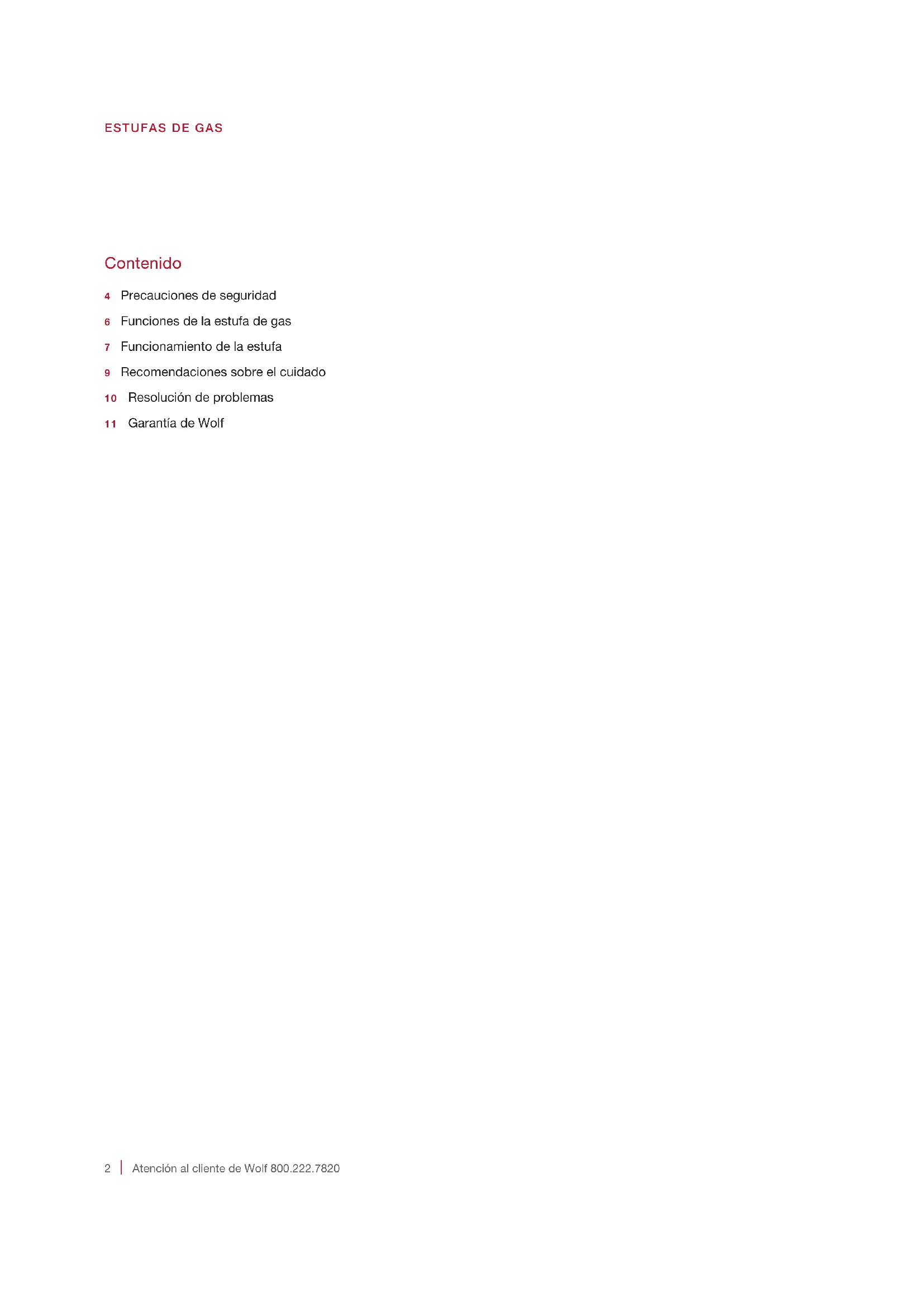 Atención al cliente de Wolf 800.222.7820 Contenido 4 Precauciones de seguridad6 Funciones de la estufa de gas7 Funcionamiento de la estufa9 Recomendaciones sobre el cuidado10 Resolución de problemas11 Garantía de Wolf ESTUFAS DE GASwolfappliance.com