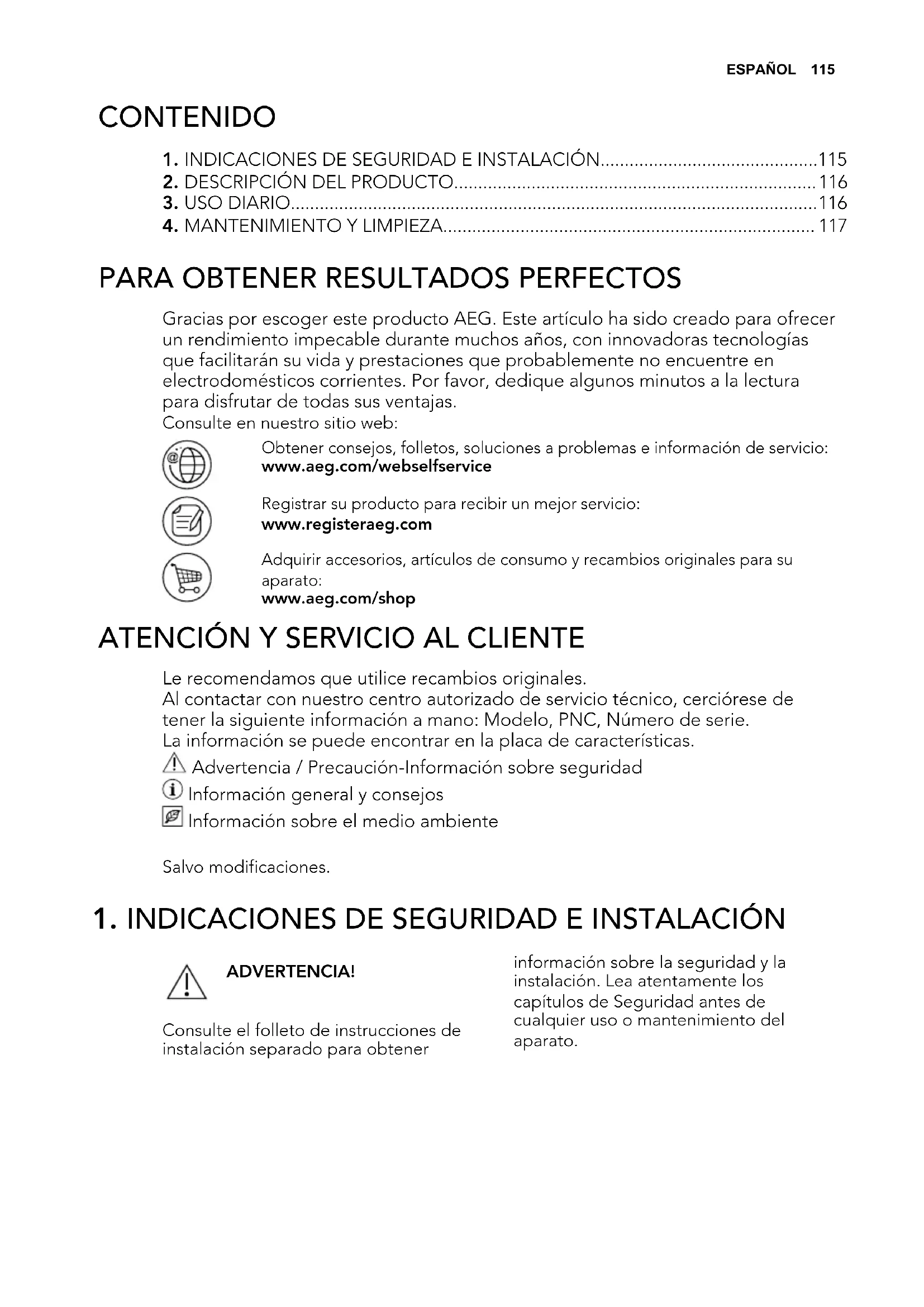 Gracias por escoger este producto AEG. Este artículo ha sido creado para ofrecer un rendimiento impecable durante muchos años, con innovadoras tecnologías que facilitarán su vida y prestaciones que probablemente no encuentre en electrodomésticos corrientes. Por favor, dedique algunos minutos a la lectura para disfrutar de todas sus ventajas. Consulte en nuestro sitio web: Obtener consejos, folletos, soluciones a problemas e información de servicio: www.aeg.com/webselfservice Registrar su producto para recibir un mejor servicio: www.registeraeg.com Adquirir accesorios, artículos de consumo y recambios originales para su aparato: www.aeg.com/shop