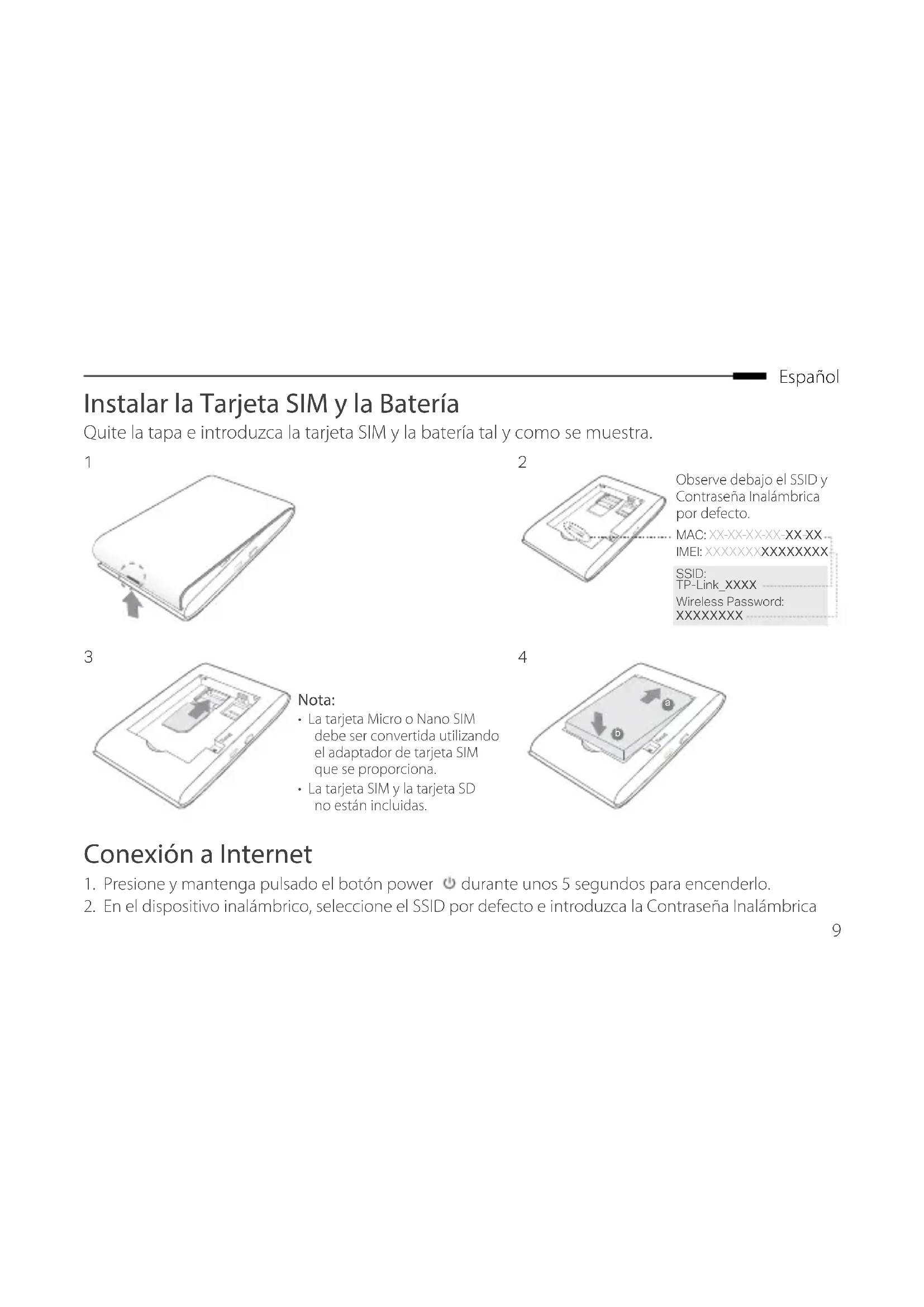 SSID: Wireless Password: TP-Link_XXXX MAC: XX-XX-XX-XX-XX-XX XXXXXXXX IMEI: XXXXXXXXXXXXXXX Observe debajo el SSID y Contraseña Inalámbrica por defecto.10 Español en la parte interior de la tapa. Nota: Recomendamos encarecidamente que cambie el nombre y contraseña inalámbricos por defecto por seguridad en la red. ¡Disfrute! Nota: