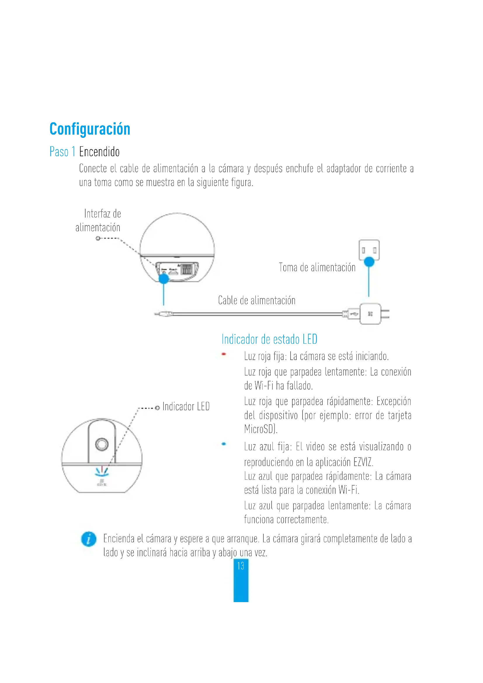 verbunden war, verbindet sie sich automatisch wieder mit diesem WLAN.12 Anhang Lieferumfang 1x Kamera 1x Montagefuß 1x Stromkabel 1x Bohrschablone 1x Schraubensatz 1x Netzteil 1x Kurzanleitung13 Configuración Paso 1 Encendido Conecte el cable de alimentación a la cámara y después enchufe el adaptador de corriente a una toma como se muestra en la siguiente figura. Toma de alimentación Interfaz de alimentación Cable de alimentación Indicador de estado LED Luz roja fija: La cámara se está iniciando. Luz roja que parpadea lentamente: La conexión de Wi-Fi ha fallado. Luz roja que parpadea rápidamente: Excepción del dispositivo (por ejemplo: error de tarjeta MicroSD). Luz azul fija: El video se está visualizando o reproduciendo en la aplicación EZVIZ. Luz azul que parpadea rápidamente: La cámara está lista para la conexión Wi-Fi. Luz azul que parpadea lentamente: La cámara funciona correctamente. Indicador LED Encienda el cámara y espere a que arranque. La cámara girará completamente de lado a lado y se inclinará hacia arriba y abajo una vez.14 Paso 2 Configuración de la cámara