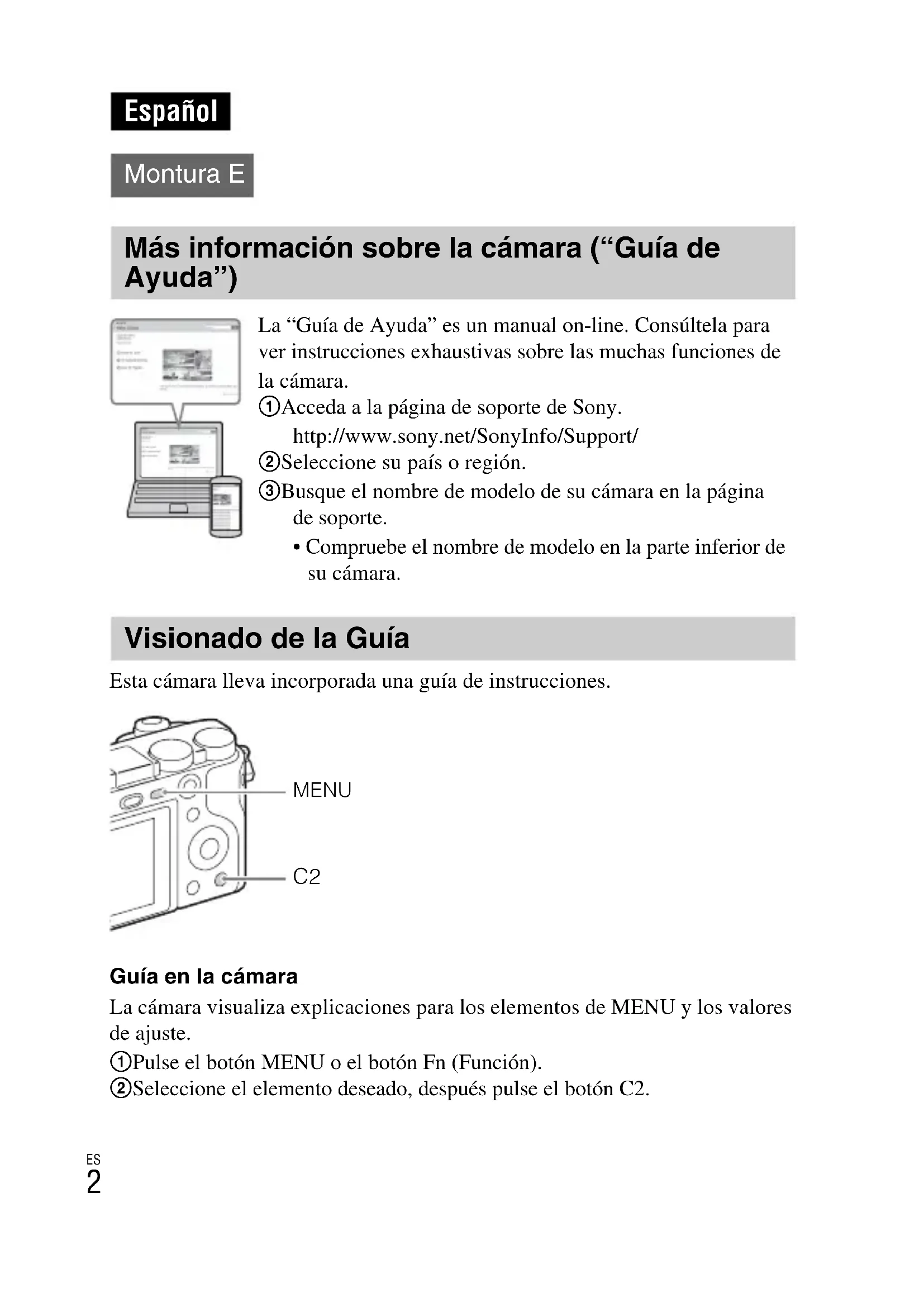 Esta cámara lleva incorporada una guía de instrucciones. Guía en la cámara La cámara visualiza explicaciones para los elementos de MENU y los valores de ajuste. 1 Pulse el botón MENU o el botón Fn (Función). 2 Seleccione el elemento deseado, después pulse el botón C2. Español Montura E Más información sobre la cámara (“Guía de Ayuda”) La “Guía de Ayuda” es un manual on-line. Consúltela para ver instrucciones exhaustivas sobre las muchas funciones de la cámara. 1 Acceda a la página de soporte de Sony. http://www.sony.net/SonyInfo/Support/ 2 Seleccione su país o región. 3 Busque el nombre de modelo de su cámara en la página de soporte.