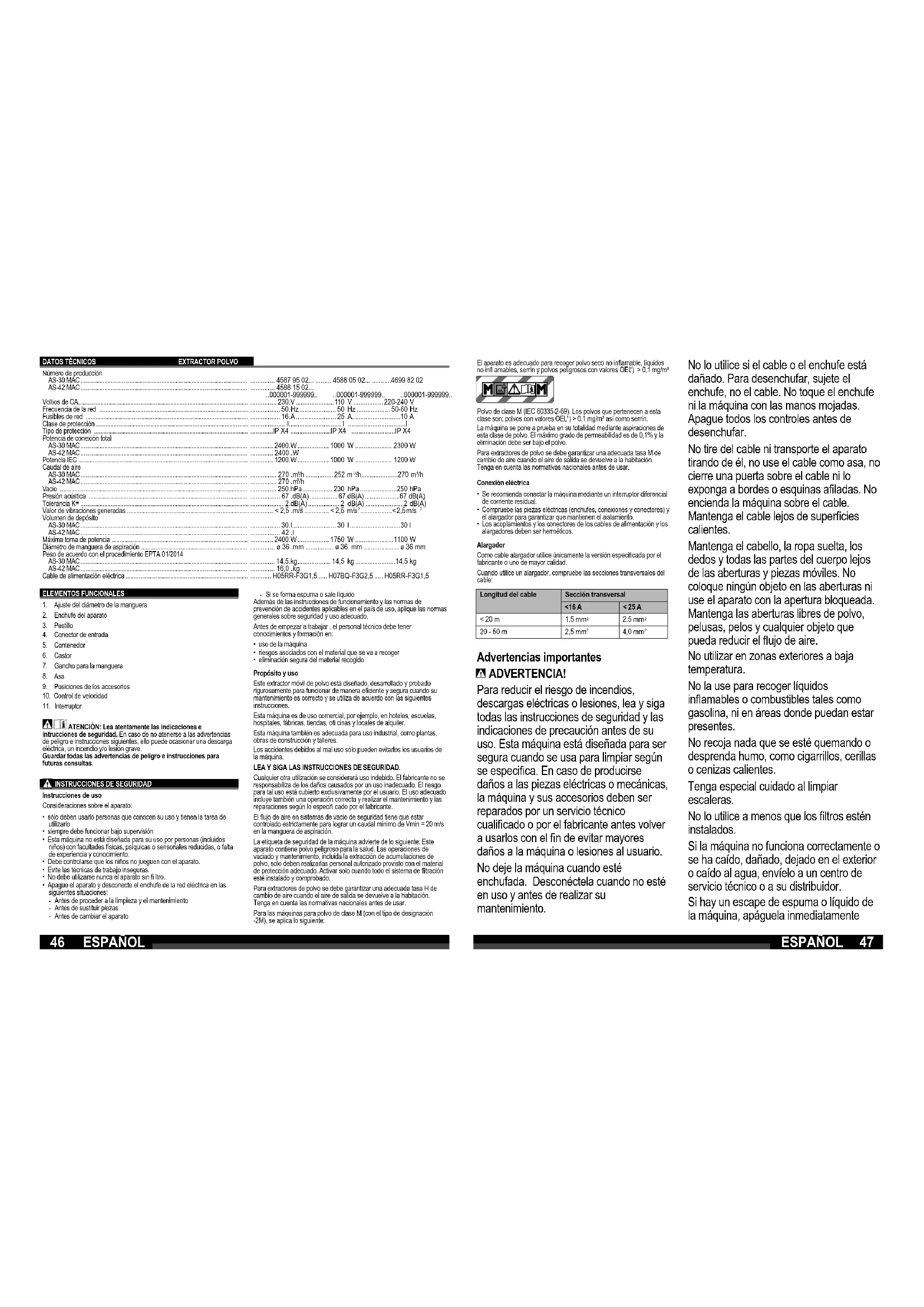 - eliminación segura del material recogido Propósito y uso Este extractor móvil de polvo está diseñado, desarrollado y probado rigurosamente para funcionar de manera efi ciente y segura cuando su mantenimiento es correcto y se utiliza de acuerdo con las siguientes instrucciones. Esta máquina es de uso comercial, por ejemplo, en hoteles, escuelas, hospitales, fábricas, tiendas, ofi cinas y locales de alquiler. Esta máquina también es adecuada para uso industrial, como plantas, obras de construcción y talleres. Los accidentes debidos al mal uso sólo pueden evitarlos los usuarios de la máquina. LEA Y SIGA LAS INSTRUCCIONES DE SEGURIDAD. Cualquier otra utilización se considerará uso indebido. El fabricante no se responsabiliza de los daños causados por un uso inadecuado. El riesgo para tal uso está cubierto exclusivamente por el usuario. El uso adecuado incluye también una operación correcta y realizar el mantenimiento y las reparaciones según lo especifi cado por el fabricante. El fl ujo de aire en sistemas de vacío de seguridad tiene que estar controlado estrictamente para lograr un caudal mínimo de Vmin = 20 m/s en la manguera de aspiración. La etiqueta de seguridad de la máquina advierte de lo siguiente: Este aparato contiene polvo peligroso para la salud. Las operaciones de vaciado y mantenimiento, incluida la extracción de acumulaciones de polvo, solo deben realizarlas personal autorizado provisto con el material de protección adecuado. Activar solo cuando todo el sistema de fi ltración esté instalado y comprobado. Para extractores de polvo se debe garantizar una adecuada tasa H de cambio de aire cuando el aire de salida se devuelve a la habitación. Tenga en cuenta las normativas nacionales antes de usar. Para las máquinas para polvo de clase M (con el tipo de designación -2M), se aplica lo siguiente: El aparato es adecuado para recoger polvo seco no infl amable, líquidos no infl amables, serrín y polvos peligrosos con valores OEL