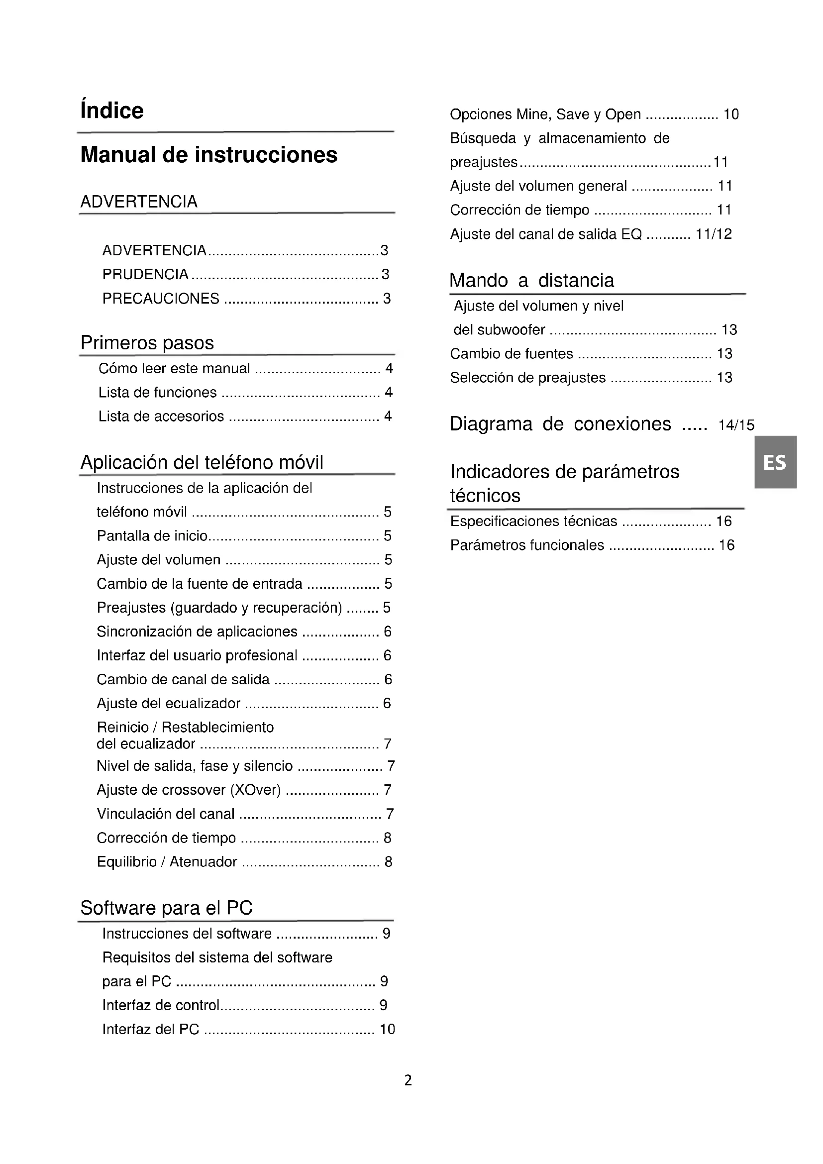 Mando a distancia con cable Funcionamiento básico Cambio de la fuente de entrada 4 10 13 Ajuste del volumen 4 11 13 Preajustes 4 11 13 Modo Pro 5 - - Funcionamiento del canal Cambio del canal de salida 5 11 - Ajuste del ecualizador 6 11 - Ajuste de crossover 7 11 - Corrección de tiempo 7 11 - Equilibrio y atenuador 7 11 - Nota: Prioridad: Reproducción de música: Bluetooth > nivel alto, nivel bajo; Conexiones de datos: Aplicación del teléfono móvil, software para el PC > Mando a distancia con cable.