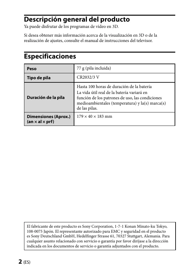 Descripción general del producto Ya puede disfrutar de los programas de vídeo en 3D. Si desea obtener más información acerca de la visualización en 3D o de la realización de ajustes, consulte el manual de instrucciones del televisor. Especificaciones Peso Duración de la pila Hasta 100 horas de duración de la batería La vida útil real de la batería variará en función de los patrones de uso, las condiciones medioambientales (temperatura) y la(s) marca(s) de las pilas. El fabricante de este producto es Sony Corporation, 1-7-1 Konan Minato-ku Tokyo, 108-0075 Japón. El representante autorizado para EMC y seguridad en el producto es Sony Deutschland GmbH, Hedelfinger Strasse 61, 70327 Stuttgart, Alemania. Para cualquier asunto relacionado con servicio o garantía por favor diríjase a la dirección indicada en los documentos de servicio o garantía adjuntados con el producto. (ES) Tratamiento de las baterías al final de su vida útil (aplicable en la Unión Europea y en países europeos con sistemas de recogida selectiva de residuos) Este símbolo en la batería o en el embalaje indica que la batería proporcionada con este producto no puede ser tratada como un residuo doméstico normal. En algunas baterías este símbolo puede utilizarse en combinación con el símbolo químico. El símbolo químico del mercurio (Hg) o del plomo (Pb) se añadirá si la batería contiene más del 0,0005% de mercurio o del 0,004% de plomo. Al asegurarse de que estas baterías se desechan correctamente, Ud. ayuda a prevenir las consecuencias negativas para el medio ambiente y la salud humana que podrían derivarse de la incorrecta manipulación en el momento de deshacerse de la batería. El reciclaje de materiales ayuda a conservar los recursos naturales. En el caso de productos que por razones de seguridad, rendimiento o mantenimiento de datos, sea necesaria una conexión permanente con la batería incorporada, esta batería solo deberá ser reemplazada por personal técnico cualificado para ello. Para asegurarse de que la batería será tratada correctamente, entregue el producto al final de su vida útil en un punto de recogida para el reciclado de aparatos eléctricos y electrónicos. Para las demás baterías, vea la sección donde se indica cómo quitar la batería del producto de forma segura. Deposite la batería en el correspondiente punto de recogida para el reciclado. Para recibir información detallada sobre el reciclaje de este producto o de la batería, póngase en contacto con el ayuntamiento, el punto de recogida más cercano o el establecimiento donde ha adquirido el producto. Tratamiento de las Gafas 3D al final de su vida útil Tratamiento de los equipos eléctricos y electrónicos al final de su vida útil (aplicable en la Unión Europea y en países europeos con sistemas de recogida selectiva de residuos) Este símbolo en el equipo o el embalaje indica que el presente producto no puede ser tratado como residuo doméstico normal, sino que debe entregarse en el correspondiente punto de recogida de equipos eléctricos y electrónicos. Al asegurarse de que este producto sea desechado correctamente, Ud. ayuda a prevenir las consecuencias negativas para el medio ambiente y la salud humana que podrían derivarse de la incorrecta manipulación en el momento de deshacerse de este producto. El reciclaje de materiales ayuda a conservar los recursos naturales. Para recibir información detallada sobre el reciclaje de este producto, póngase en contacto con su ayuntamiento, el punto de recogida más cercano o el establecimiento donde ha adquirido el producto. (ES)