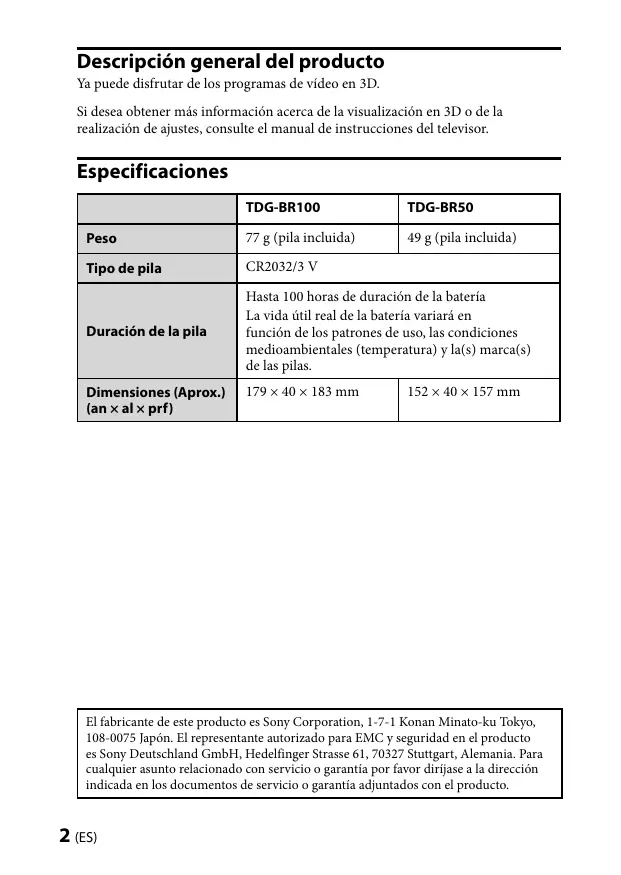 Descripción general del producto Ya puede disfrutar de los programas de vídeo en 3D. Si desea obtener más información acerca de la visualización en 3D o de la realización de ajustes, consulte el manual de instrucciones del televisor. Especificaciones TDG-BR100 TDG-BR50 Peso Duración de la pila Hasta 100 horas de duración de la batería La vida útil real de la batería variará en función de los patrones de uso, las condiciones medioambientales (temperatura) y la(s) marca(s) de las pilas. El fabricante de este producto es Sony Corporation, 1-7-1 Konan Minato-ku Tokyo, 108-0075 Japón. El representante autorizado para EMC y seguridad en el producto es Sony Deutschland GmbH, Hedelfinger Strasse 61, 70327 Stuttgart, Alemania. Para cualquier asunto relacionado con servicio o garantía por favor diríjase a la dirección indicada en los documentos de servicio o garantía adjuntados con el producto. (ES) Tratamiento de las baterías al final de su vida útil (aplicable en la Unión Europea y en países europeos con sistemas de recogida selectiva de residuos) Este símbolo en la batería o en el embalaje indica que la batería proporcionada con este producto no puede ser tratada como un residuo doméstico normal. En algunas baterías este símbolo puede utilizarse en combinación con el símbolo químico. El símbolo químico del mercurio (Hg) o del plomo (Pb) se añadirá si la batería contiene más del 0,0005% de mercurio o del 0,004% de plomo. Al asegurarse de que estas baterías se desechan correctamente, Ud. ayuda a prevenir las consecuencias negativas para el medio ambiente y la salud humana que podrían derivarse de la incorrecta manipulación en el momento de deshacerse de la batería. El reciclaje de materiales ayuda a conservar los recursos naturales. En el caso de productos que por razones de seguridad, rendimiento o mantenimiento de datos, sea necesaria una conexión permanente con la batería incorporada, esta batería solo deberá ser reemplazada por personal técnico cualificado para ello. Para asegurarse de que la batería será tratada correctamente, entregue el producto al final de su vida útil en un punto de recogida para el reciclado de aparatos eléctricos y electrónicos. Para las demás baterías, vea la sección donde se indica cómo quitar la batería del producto de forma segura. Deposite la batería en el correspondiente punto de recogida para el reciclado. Para recibir información detallada sobre el reciclaje de este producto o de la batería, póngase en contacto con el ayuntamiento, el punto de recogida más cercano o el establecimiento donde ha adquirido el producto. Tratamiento de las Gafas 3D al final de su vida útil Tratamiento de los equipos eléctricos y electrónicos al final de su vida útil (aplicable en la Unión Europea y en países europeos con sistemas de recogida selectiva de residuos) Este símbolo en el equipo o el embalaje indica que el presente producto no puede ser tratado como residuo doméstico normal, sino que debe entregarse en el correspondiente punto de recogida de equipos eléctricos y electrónicos. Al asegurarse de que este producto sea desechado correctamente, Ud. ayuda a prevenir las consecuencias negativas para el medio ambiente y la salud humana que podrían derivarse de la incorrecta manipulación en el momento de deshacerse de este producto. El reciclaje de materiales ayuda a conservar los recursos naturales. Para recibir información detallada sobre el reciclaje de este producto, póngase en contacto con su ayuntamiento, el punto de recogida más cercano o el establecimiento donde ha adquirido el producto. Precaución Lea estas instrucciones de seguridad para garantizar su seguridad personal y evitar daños materiales. (Continuación) (ES)