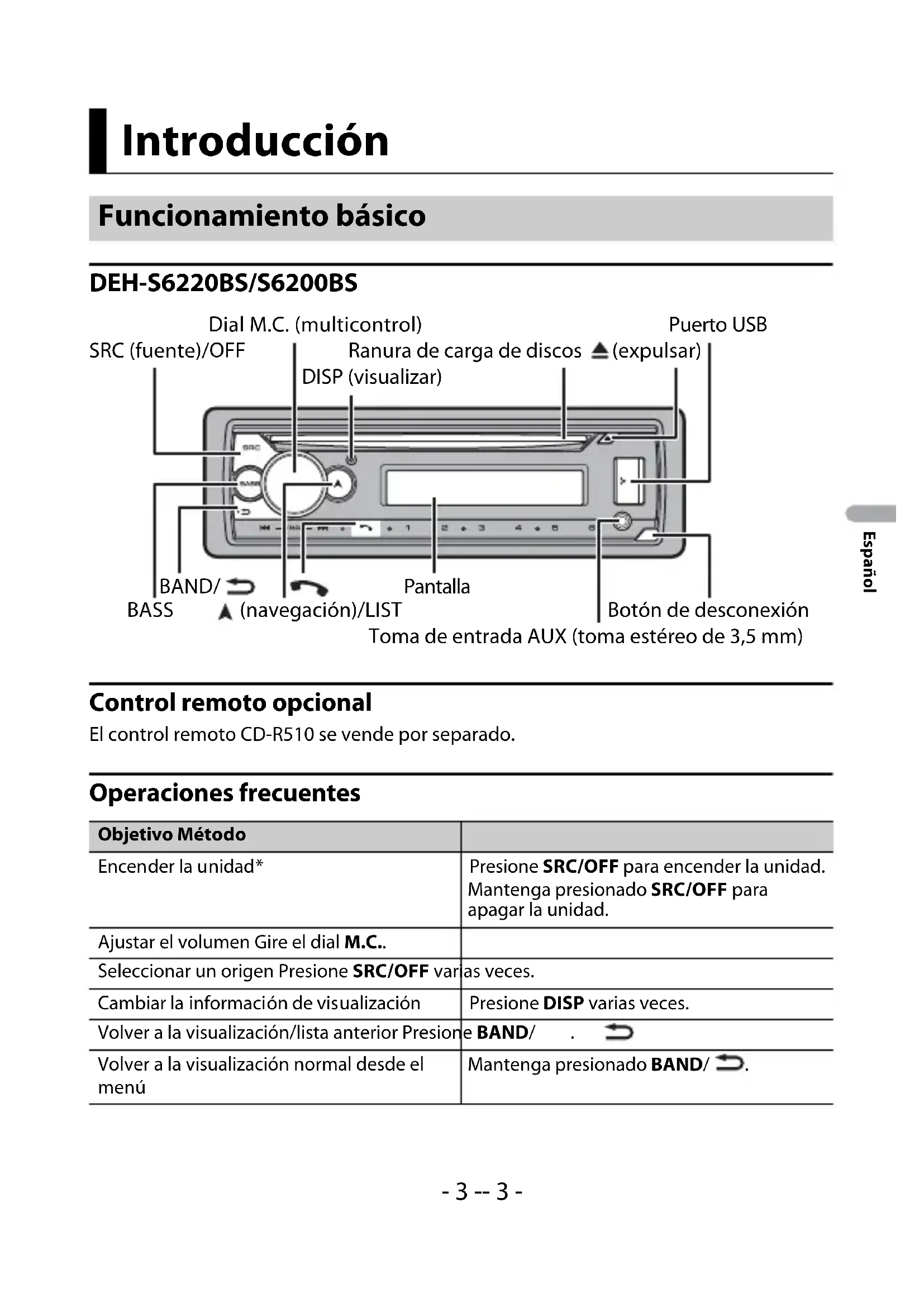 Control remoto opcional El control remoto CD-R510 se vende por separado. Operaciones frecuentes Introducción Funcionamiento básico Objetivo Método Encender la unidad* Presione SRC/OFF para encender la unidad. Mantenga presionado SRC/OFF para apagar la unidad.Ajustar el volumen Gire el dial M.C..Seleccionar un origen Presione SRC/OFF varias veces. Cambiar la información de visualización Presione DISP varias veces. Volver a la visualización/lista anterior Presione BAND/.Volver a la visualización normal desde el menú Mantenga presionado BAND/. SRC (fuente)/OFF Botón de desconexión Pantalla Dial M.C. (multicontrol) BAND/ DISP (visualizar) (navegación)/LIST Puerto USB Toma de entrada AUX (toma estéreo de 3,5 mm) (expulsar) Ranura de carga de discos BASS- 4 - Español