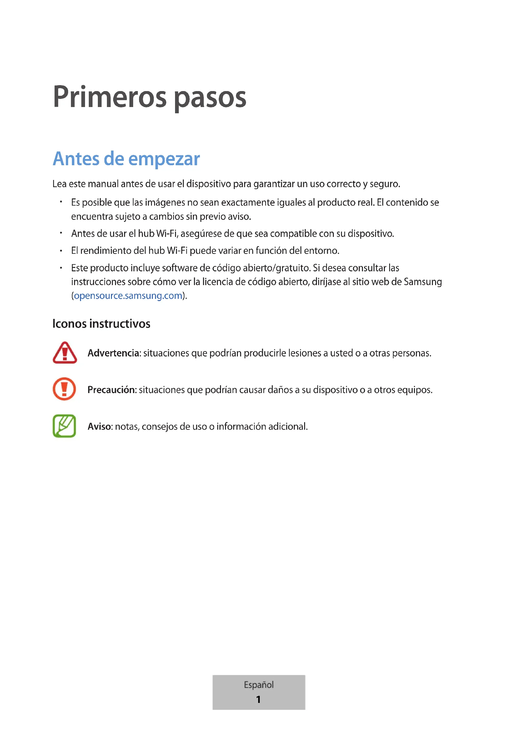 Este producto incluye software de código abierto/gratuito. Si desea consultar las instrucciones sobre cómo ver la licencia de código abierto, diríjase al sitio web de Samsung (opensource.samsung.com). Iconos instructivos Advertencia: situaciones que podrían producirle lesiones a usted o a otras personas. Precaución: situaciones que podrían causar daños a su dispositivo o a otros equipos. Aviso: notas, consejos de uso o información adicional. Español 1Primeros pasos