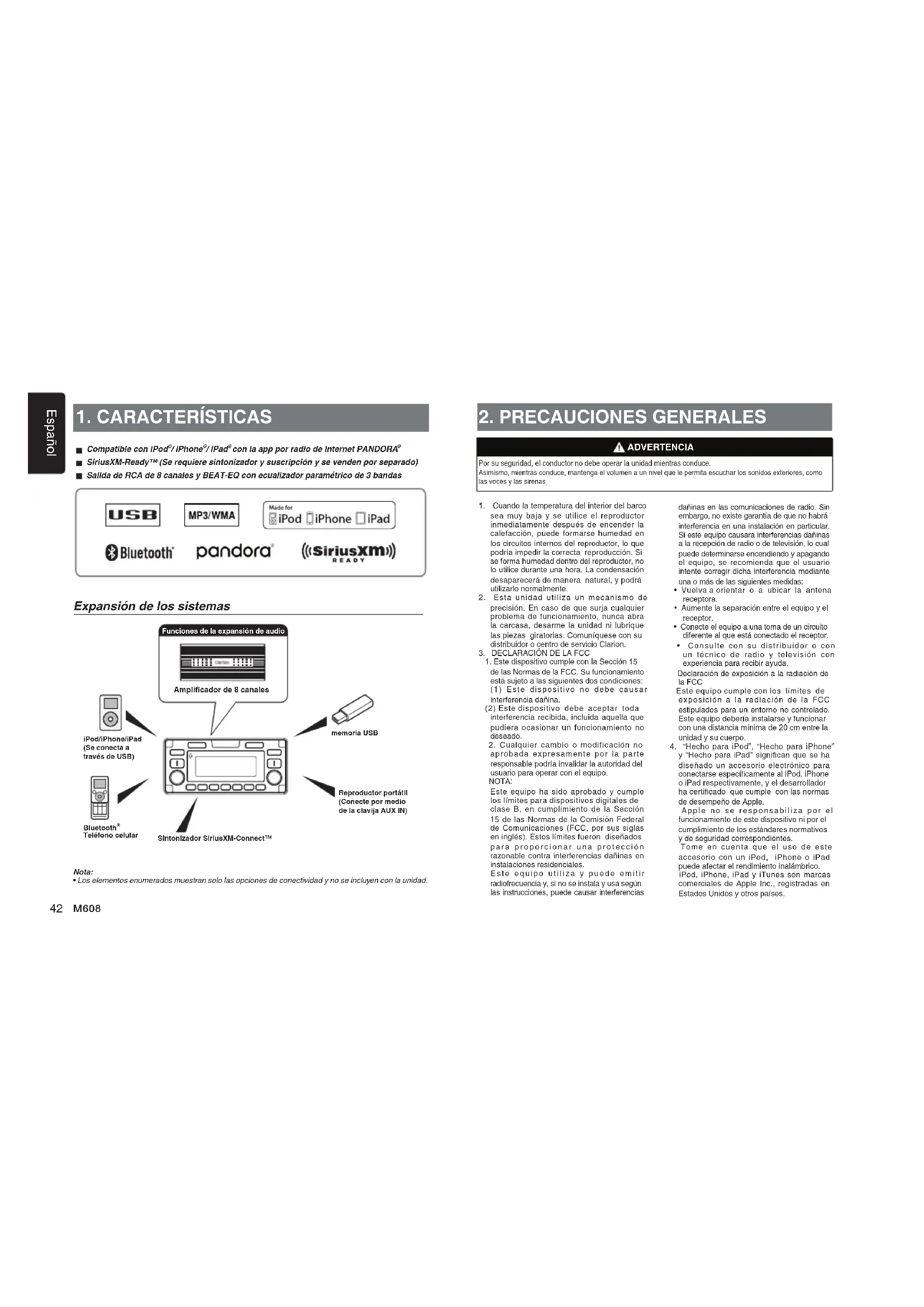 Por su seguridad, el conductor no debe operar la unidad mientras conduce. Asimismo, mientras conduce, mantenga el volumen a un nivel que le permita escuchar los sonidos exteriores, como las voces y las sirenas 1. Cuando la temperatura del interior del barco sea muy baja y se utilice el reproductor inmediatamente después de encender la calefacción, puede formarse humedad en los circuitos internos del reproductor, lo que podría impedir la correcta reproducción. Si se forma humedad dentro del reproductor, no lo utilice durante una hora. La condensación desaparecerá de manera natural, y podrá utilizarlo normalmente. 2. Esta unidad utiliza un mecanismo de precisión. En caso de que surja cualquier problema de funcionamiento, nunca abra la carcasa, desarme la unidad ni lubrique las piezas giratorias. Comuníquese con su distribuidor o centro de servicio Clarion.3. DECLARACIÓN DE LA FCC 1. Este dispositivo cumple con la Sección 15 de las Normas de la FCC. Su funcionamiento está sujeto a las siguientes dos condiciones:(1) Este dispositivo no debe causar interferencia dañina. (2) Este dispositivo debe aceptar toda interferencia recibida, incluida aquella que pudiera ocasionar un funcionamiento no deseado. 2. Cualquier cambio o modificación no aprobada expresamente por la parte responsable podría invalidar la autoridad del usuario para operar con el equipo. NOTA: Este equipo ha sido aprobado y cumple los límites para dispositivos digitales de clase B, en cumplimiento de la Sección 15 de las Normas de la Comisión Federal de Comunicaciones (FCC, por sus siglas en inglés). Estos límites fueron diseñados para proporcionar una protección razonable contra interferencias dañinas en instalaciones residenciales. Este equipo utiliza y puede emitir radiofrecuencia y, si no se instala y usa según las instrucciones, puede causar interferencias ADVERTENCIA dañinas en las comunicaciones de radio. Sin embargo, no existe garantía de que no habrá interferencia en una instalación en particular. Si este equipo causara interferencias dañinas a la recepción de radio o de televisión, lo cual puede determinarse encendiendo y apagando el equipo, se recomienda que el usuario intente corregir dicha interferencia mediante una o más de las siguientes medidas: • Vuelva a orientar o a ubicar la antena receptora. • Aumente la separación entre el equipo y el receptor. • Conecte el equipo a una toma de un circuito diferente al que está conectado el receptor. • Consulte con su distribuidor o con un técnico de radio y televisión con experiencia para recibir ayuda. Declaración de exposición a la radiación de la FCC Este equipo cumple con los límites de exposición a la radiación de la FCC estipulados para un entorno no controlado. Este equipo debería instalarse y funcionar con una distancia mínima de 20 cm entre la unidad y su cuerpo.4. “Hecho para iPod”, “Hecho para iPhone” y “Hecho para iPad” significan que se ha diseñado un accesorio electrónico para conectarse especícamente al iPod, iPhone o iPad respectivamente, y el desarrollador ha certicado que cumple con las normas de desempeño de Apple. Apple no se responsabiliza por el funcionamiento de este dispositivo ni por el cumplimiento de los estándares normativos y de seguridad correspondientes. Tome en cuenta que el uso de este accesorio con un iPod, iPhone o iPad puede afectar el rendimiento inalámbrico. iPod, iPhone, iPad y iTunes son marcas comerciales de Apple Inc., registradas en Estados Unidos y otros países.Sintonizador SiriusXM-Connect™memoria USBReproductor portátil(Conecte por medio de la clavija AUX IN)Bluetooth Teléfono celularEspañol