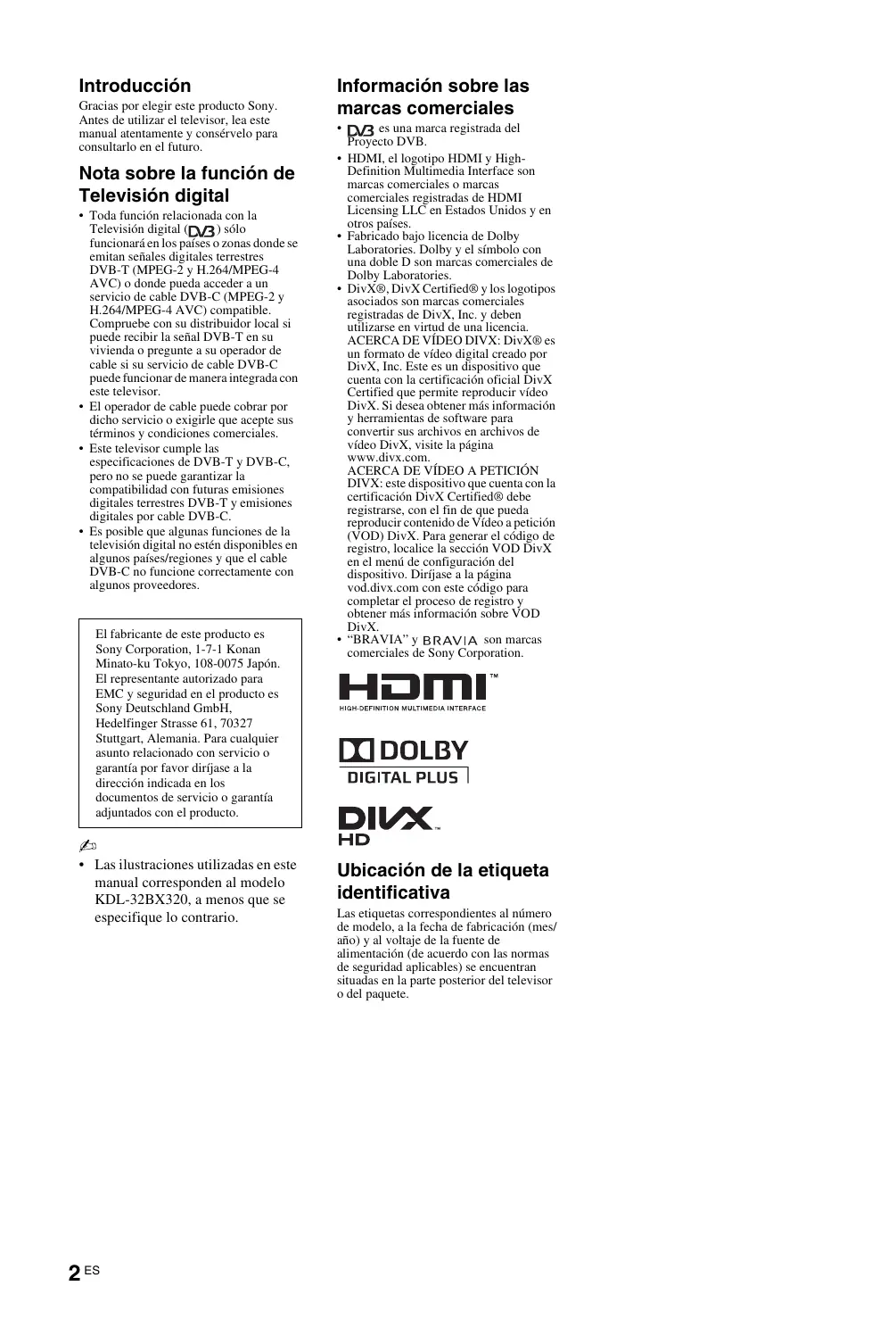 - Es posible que algunas funciones de la televisión digital no estén disponibles en algunos países/regiones y que el cable DVB-C no funcione correctamente con algunos proveedores. El fabricante de este producto es Sony Corporation, 1-7-1 Konan Minato-ku Tokyo, 108-0075 Japón. El representante autorizado para EMC y seguridad en el producto es Sony Deutschland GmbH, Hedelfinger Strasse 61, 70327 Stuttgart, Alemania. Para cualquier asunto relacionado con servicio o garantía por favor diríjase a la dirección indicada en los documentos de servicio o garantía adjuntados con el producto.