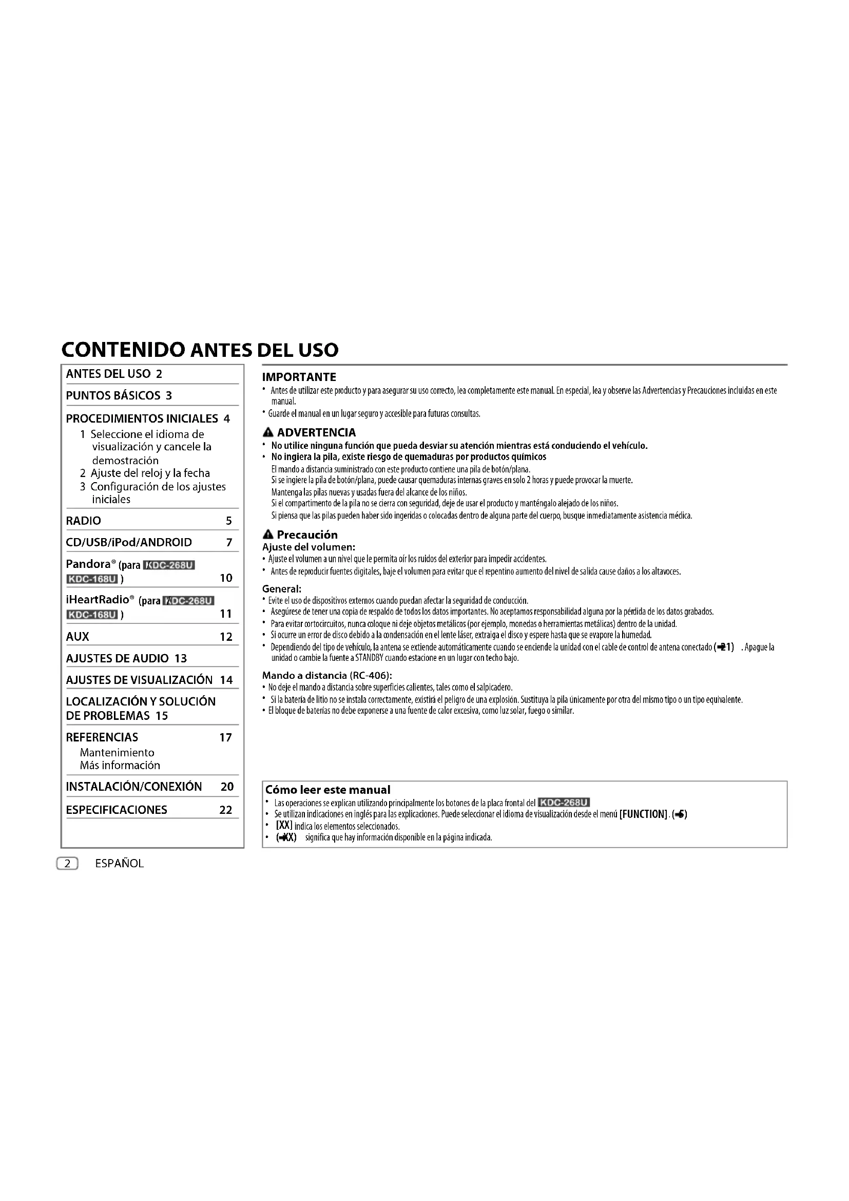 PROCEDIMIENTOS INICIALES 4 1 Seleccione el idioma de visualización y cancele la demostración 2 Ajuste del reloj y la fecha 3 Configuración de los ajustes iniciales RADIO 5 CD/USB/iPod/ANDROID 7 Pandora® (para /