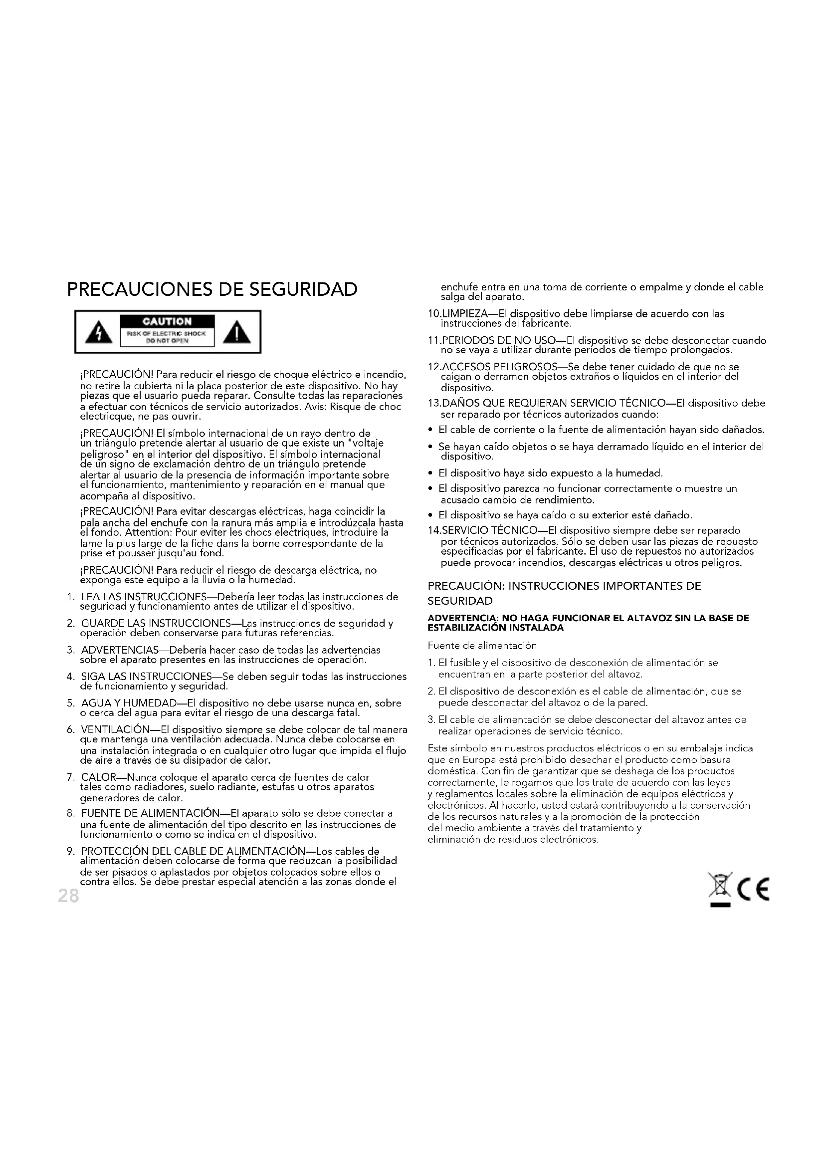 ¡PRECAUCIÓN! Para reducir el riesgo de choque eléctrico e incendio, no retire la cubierta ni la placa posterior de este dispositivo. No hay piezas que el usuario pueda reparar. Consulte todas las reparaciones a efectuar con técnicos de servicio autorizados. Avis: Risque de choc electricque, ne pas ouvrir. ¡PRECAUCIÓN! El símbolo internacional de un rayo dentro de un triángulo pretende alertar al usuario de que existe un "voltaje peligroso" en el interior del dispositivo. El símbolo internacional de un signo de exclamación dentro de un triángulo pretende alertar al usuario de la presencia de información importante sobre el funcionamiento, mantenimiento y reparación en el manual que acompaña al dispositivo. ¡PRECAUCIÓN! Para evitar descargas eléctricas, haga coincidir la pala ancha del enchufe con la ranura más amplia e introdúzcala hasta el fondo. Attention: Pour eviter les chocs electriques, introduire la lame la plus large de la fiche dans la borne correspondante de la prise et pousser jusqu'au fond. ¡PRECAUCIÓN! Para reducir el riesgo de descarga eléctrica, no exponga este equipo a la lluvia o la humedad.
