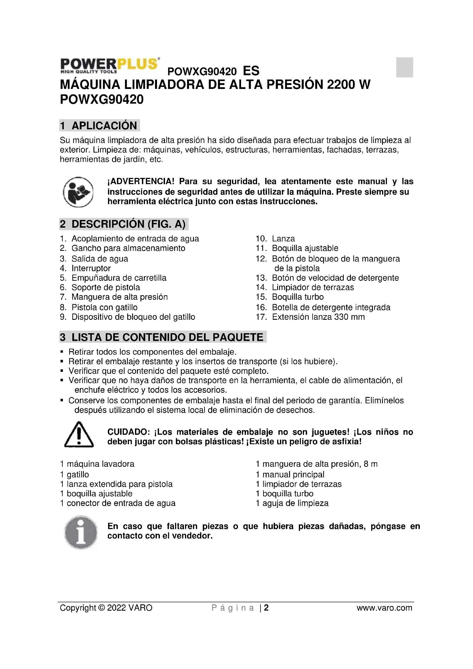 - Conserve los componentes de embalaje hasta el final del periodo de garantía. Elimínelos después utilizando el sistema local de eliminación de desechos. CUIDADO: ¡Los materiales de embalaje no son juguetes! ¡Los niños no deben jugar con bolsas plásticas! ¡Existe un peligro de asfixia! 1 máquina lavadora 1 gatillo 1 lanza extendida para pistola 1 boquilla ajustable 1 conector de entrada de agua 1 manguera de alta presión, 8 m 1 manual principal 1 limpiador de terrazas 1 boquilla turbo 1 aguja de limpieza En caso que faltaren piezas o que hubiera piezas dañadas, póngase en contacto con el vendedor.POWXG90420 ES Copyright © 2022 VARO P á g i n a | 3 www.varo.com