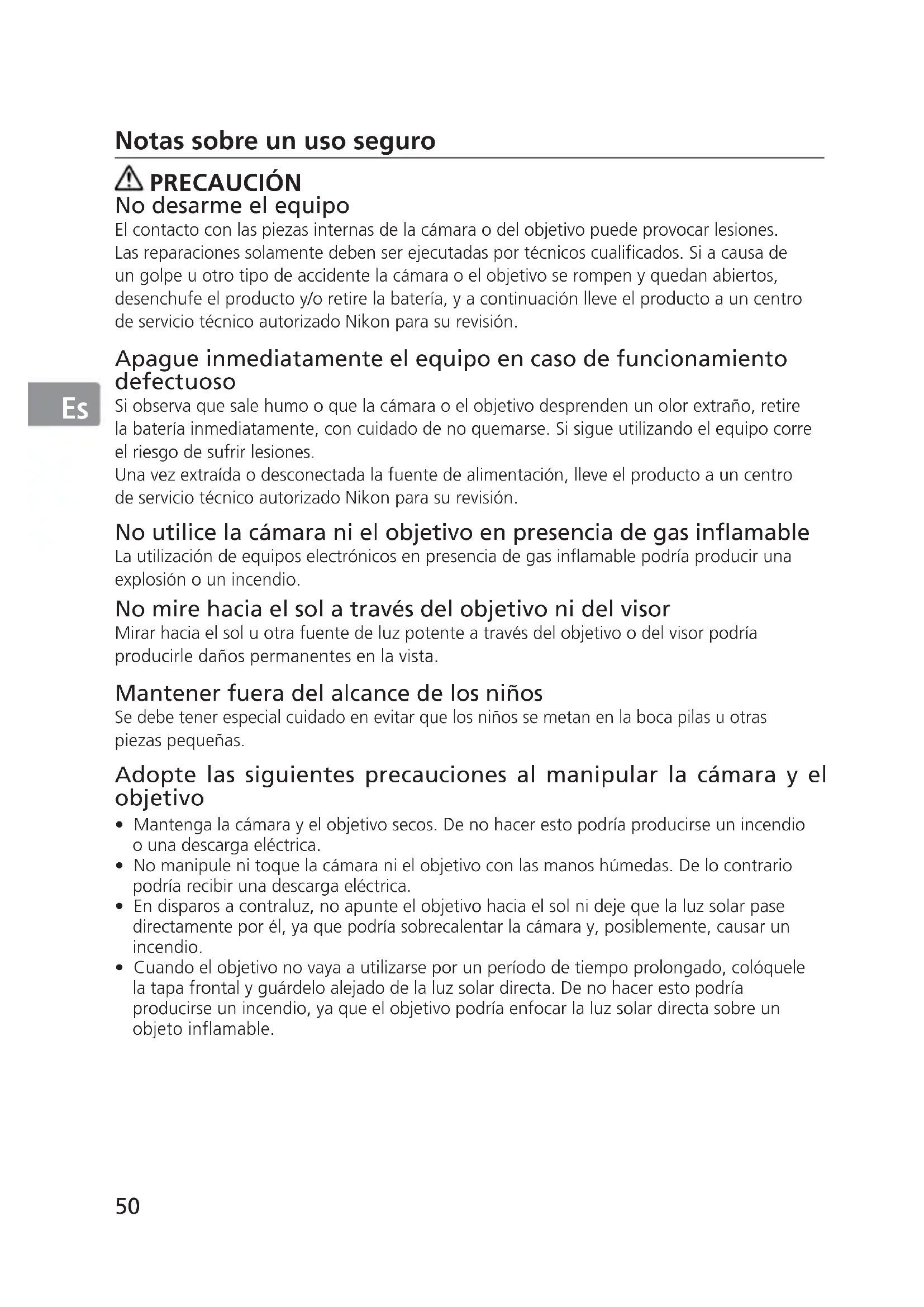 Notas sobre un uso seguro PRECAUCIÓN No desarme el equipo El contacto con las piezas internas de la cámara o del objetivo puede provocar lesiones. Las reparaciones solamente deben ser ejecutadas por técnicos cualificados. Si a causa de un golpe u otro tipo de accidente la cámara o el objetivo se rompen y quedan abiertos, desenchufe el producto y/o retire la batería, y a continuación lleve el producto a un centro de servicio técnico autorizado Nikon para su revisión. Apague inmediatamente el equipo en caso de funcionamiento defectuoso Si observa que sale humo o que la cámara o el objetivo desprenden un olor extraño, retire la batería inmediatamente, con cuidado de no quemarse. Si sigue utilizando el equipo corre el riesgo de sufrir lesiones. Una vez extraída o desconectada la fuente de alimentación, lleve el producto a un centro de servicio técnico autorizado Nikon para su revisión. No utilice la cámara ni el objetivo en presencia de gas inflamable La utilización de equipos electrónicos en presencia de gas inflamable podría producir una explosión o un incendio. No mire hacia el sol a través del objetivo ni del visor Mirar hacia el sol u otra fuente de luz potente a través del objetivo o del visor podría producirle daños permanentes en la vista. Mantener fuera del alcance de los niños Se debe tener especial cuidado en evitar que los niños se metan en la boca pilas u otras piezas pequeñas. Adopte las siguientes precauciones al manipular la cámara y el objetivo