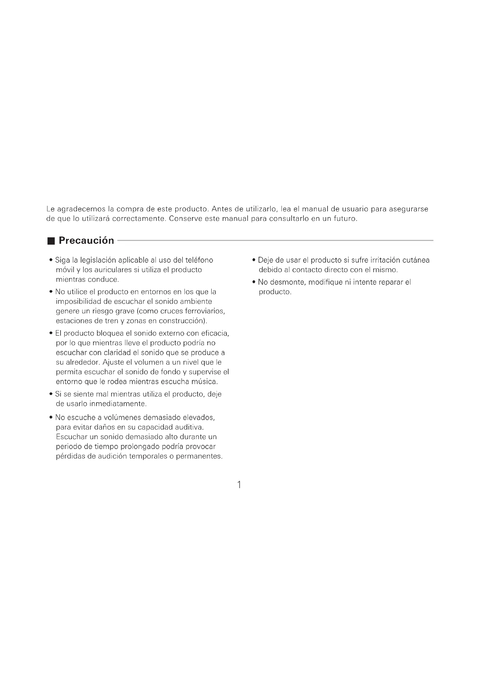 - No utilice el producto en entornos en los que la imposibilidad de escuchar el sonido ambiente genere un riesgo grave (como cruces ferroviarios, estaciones de tren y zonas en construcción).