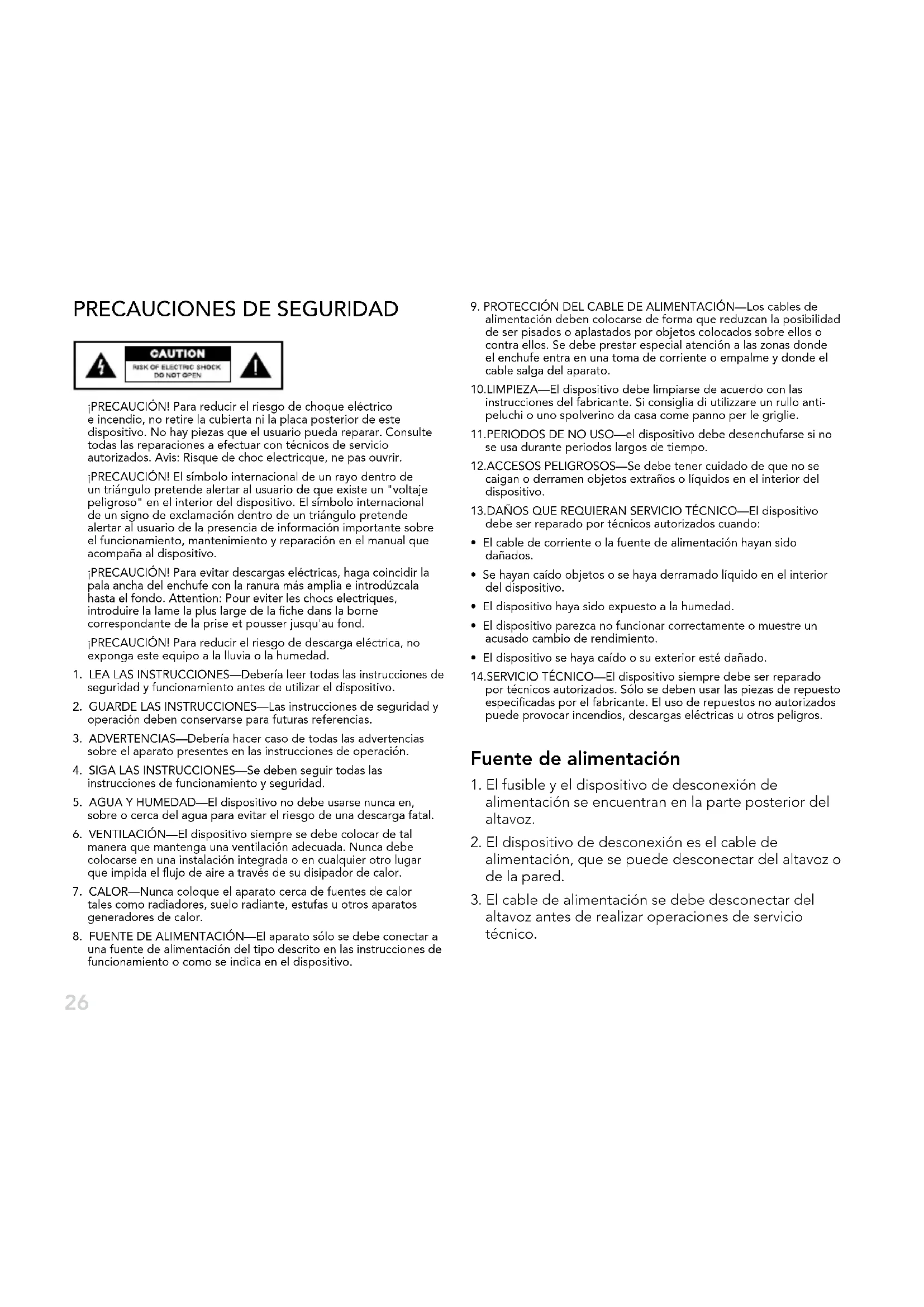 ¡PRECAUCIÓN! Para reducir el riesgo de choque eléctrico e incendio, no retire la cubierta ni la placa posterior de este dispositivo. No hay piezas que el usuario pueda reparar. Consulte todas las reparaciones a efectuar con técnicos de servicio autorizados. Avis: Risque de choc electricque, ne pas ouvrir. ¡PRECAUCIÓN! El símbolo internacional de un rayo dentro de un triángulo pretende alertar al usuario de que existe un "voltaje peligroso" en el interior del dispositivo. El símbolo internacional de un signo de exclamación dentro de un triángulo pretende alertar al usuario de la presencia de información importante sobre el funcionamiento, mantenimiento y reparación en el manual que acompaña al dispositivo. ¡PRECAUCIÓN! Para evitar descargas eléctricas, haga coincidir la pala ancha del enchufe con la ranura más amplia e introdúzcala hasta el fondo. Attention: Pour eviter les chocs electriques, introduire la lame la plus large de la fiche dans la borne correspondante de la prise et pousser jusqu'au fond. ¡PRECAUCIÓN! Para reducir el riesgo de descarga eléctrica, no exponga este equipo a la lluvia o la humedad.